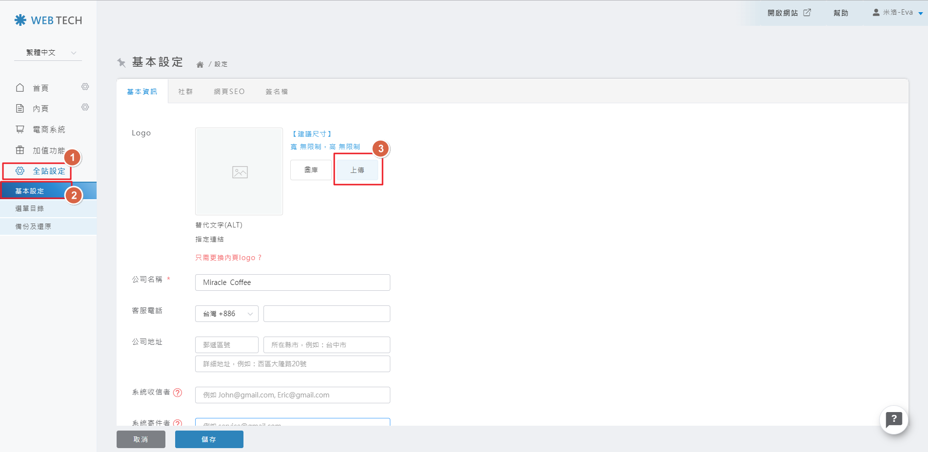 請點擊「全站設定」>「基本設定」>「上傳」。