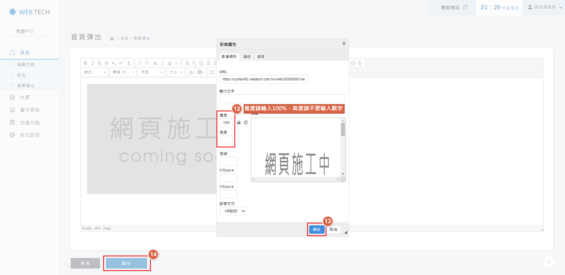 寬度請調整為100%、高度如果有數字請刪除,高度不要有任何數字,這樣圖片才能等比例縮放,調整完成後請點擊「確定」,再點擊編輯器底下的「儲存」。
