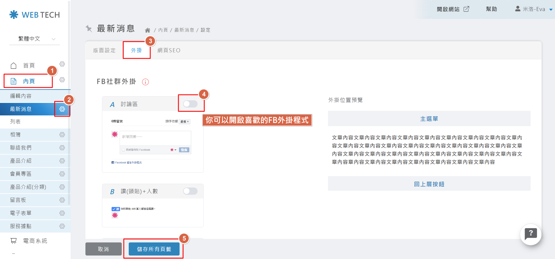 外掛的選單,請點擊該選單的設定,並選擇「外掛」的頁籤,請開啟欲使用的樣式,並點擊「儲存所有頁籤」。