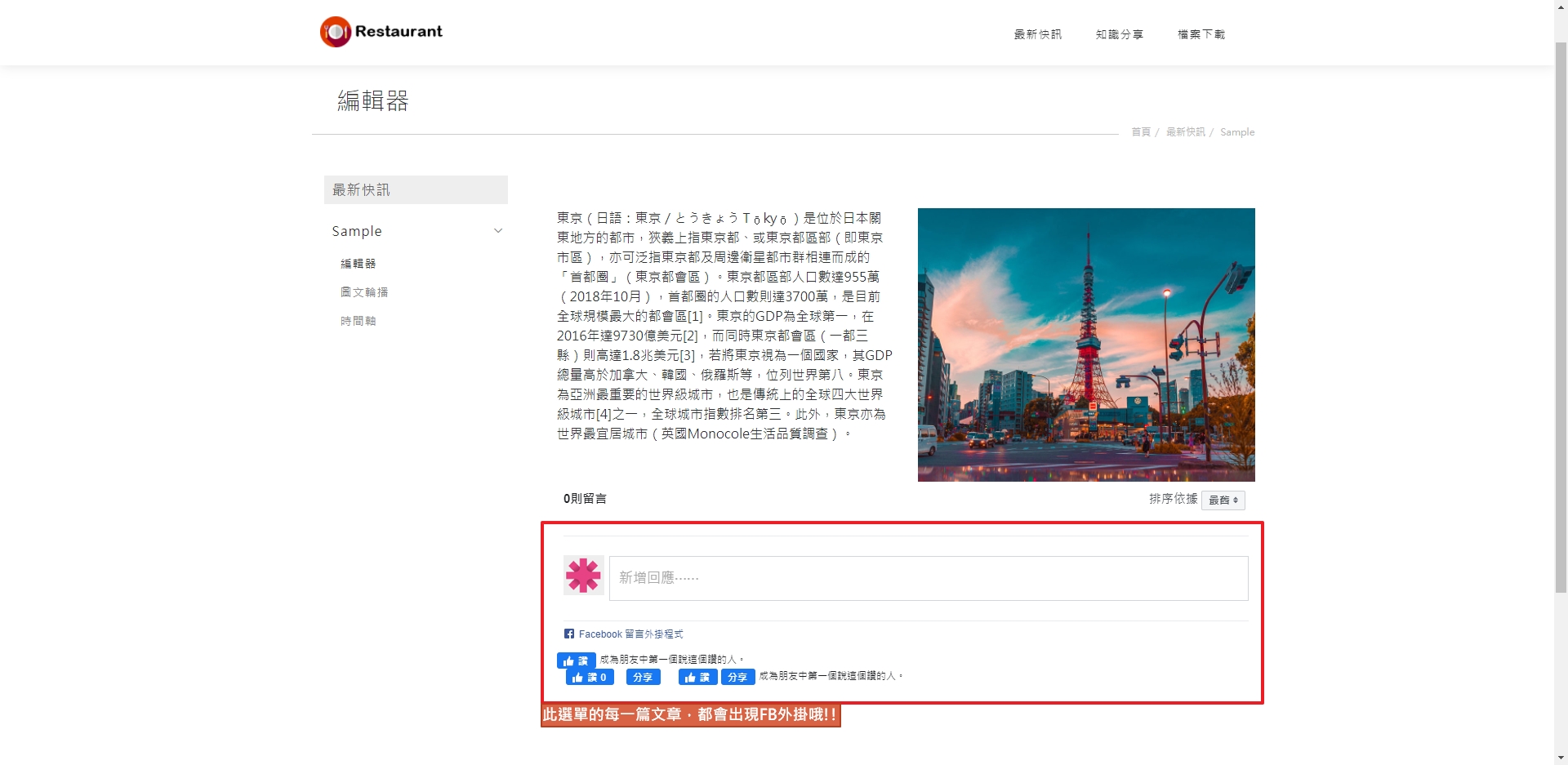 回到前台後,此選單裡面的每一篇文章,都會有FB外掛程式。