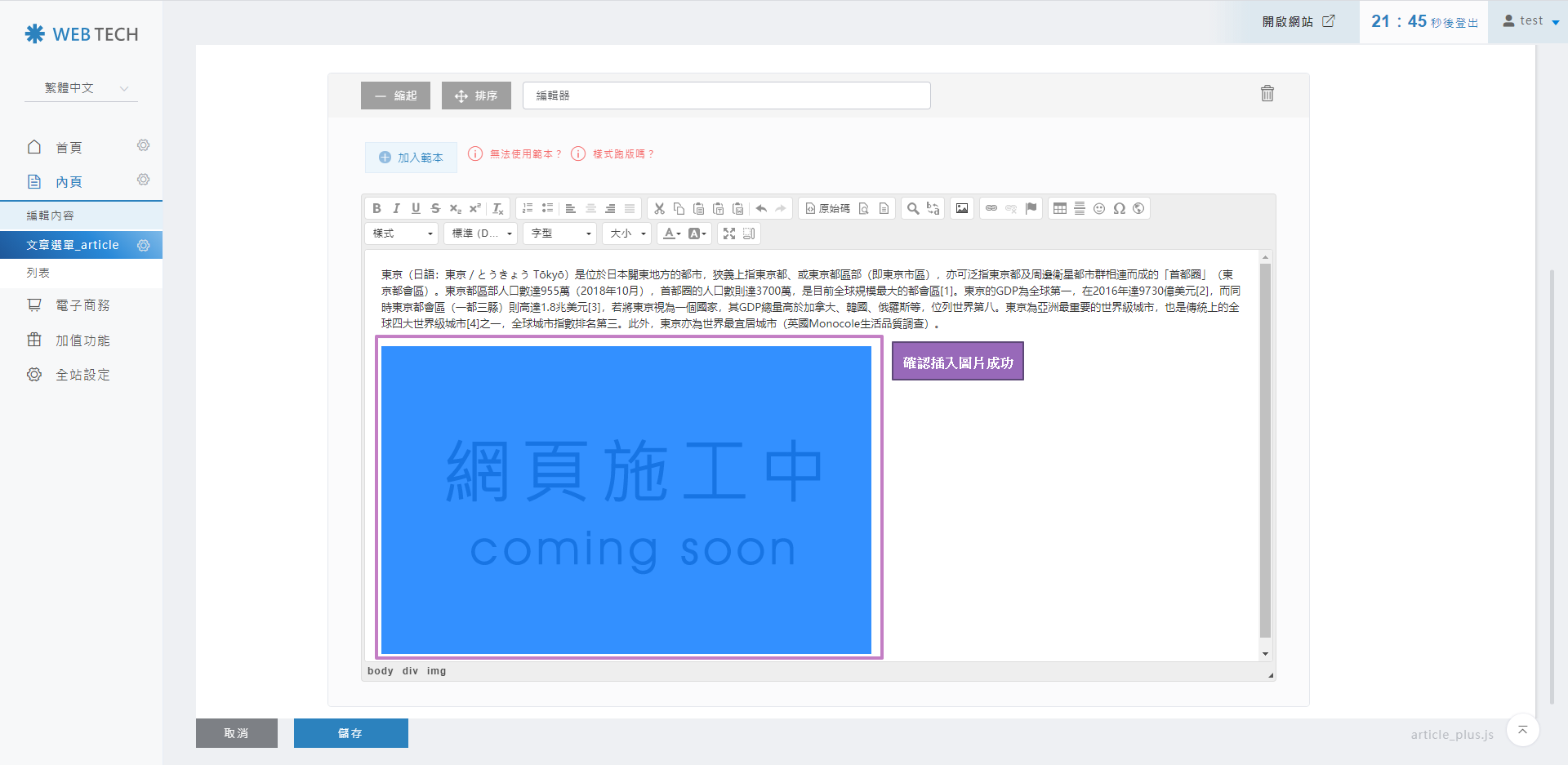 確認圖片上傳至編輯區塊成功