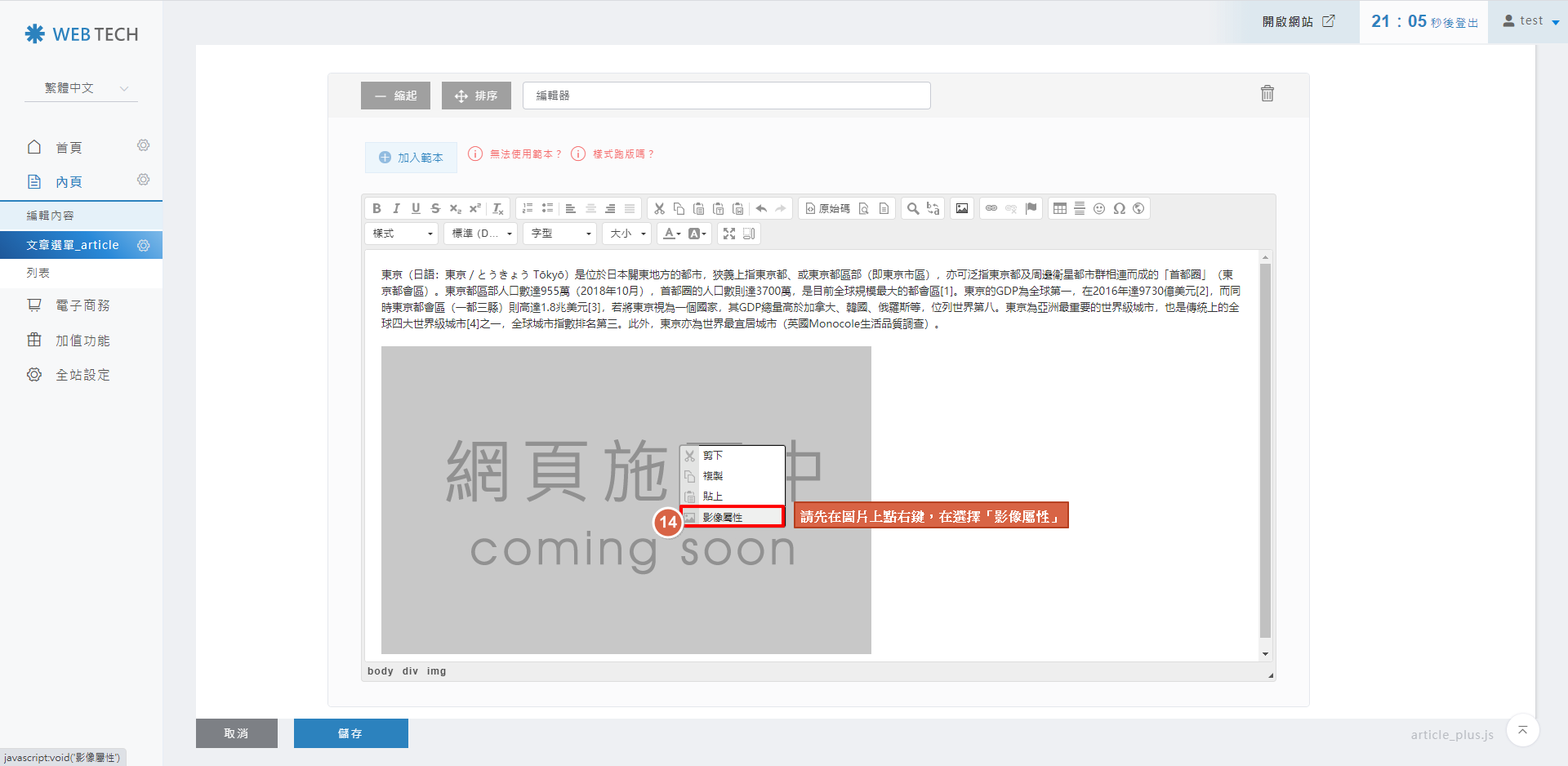 圖片插入到編輯器後,為了讓電腦、平板、手機可以正常瀏覽圖片,請在圖片上點右鍵,並選擇「影像屬性」
