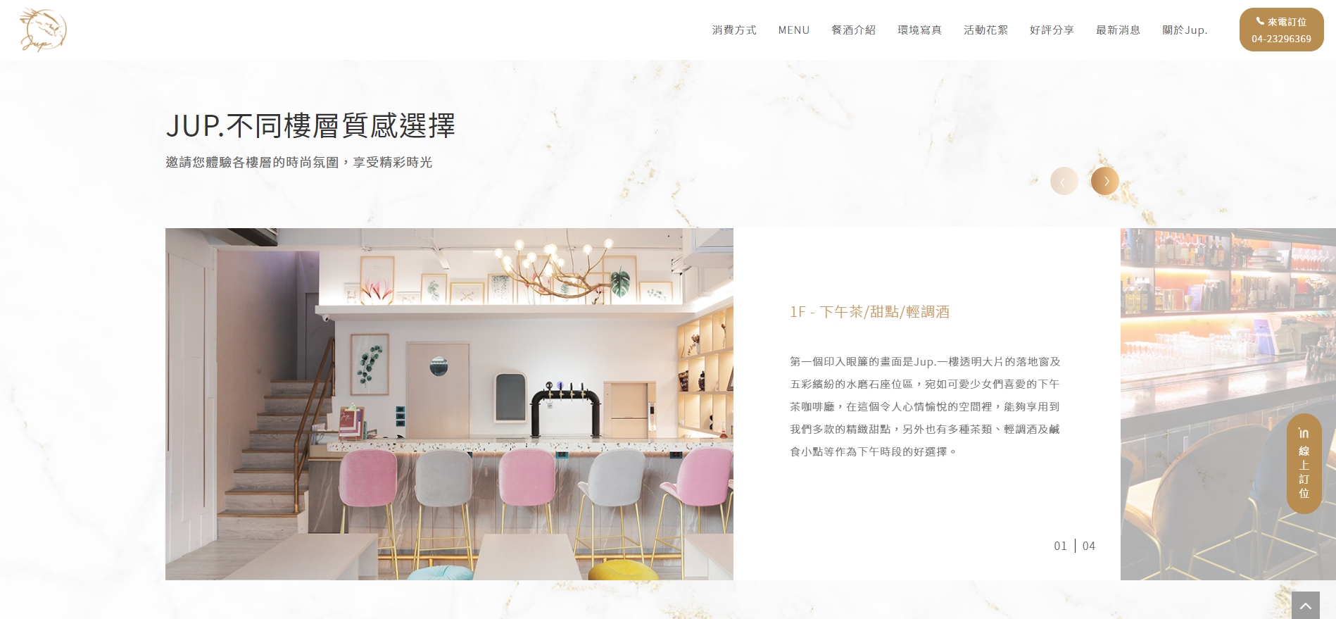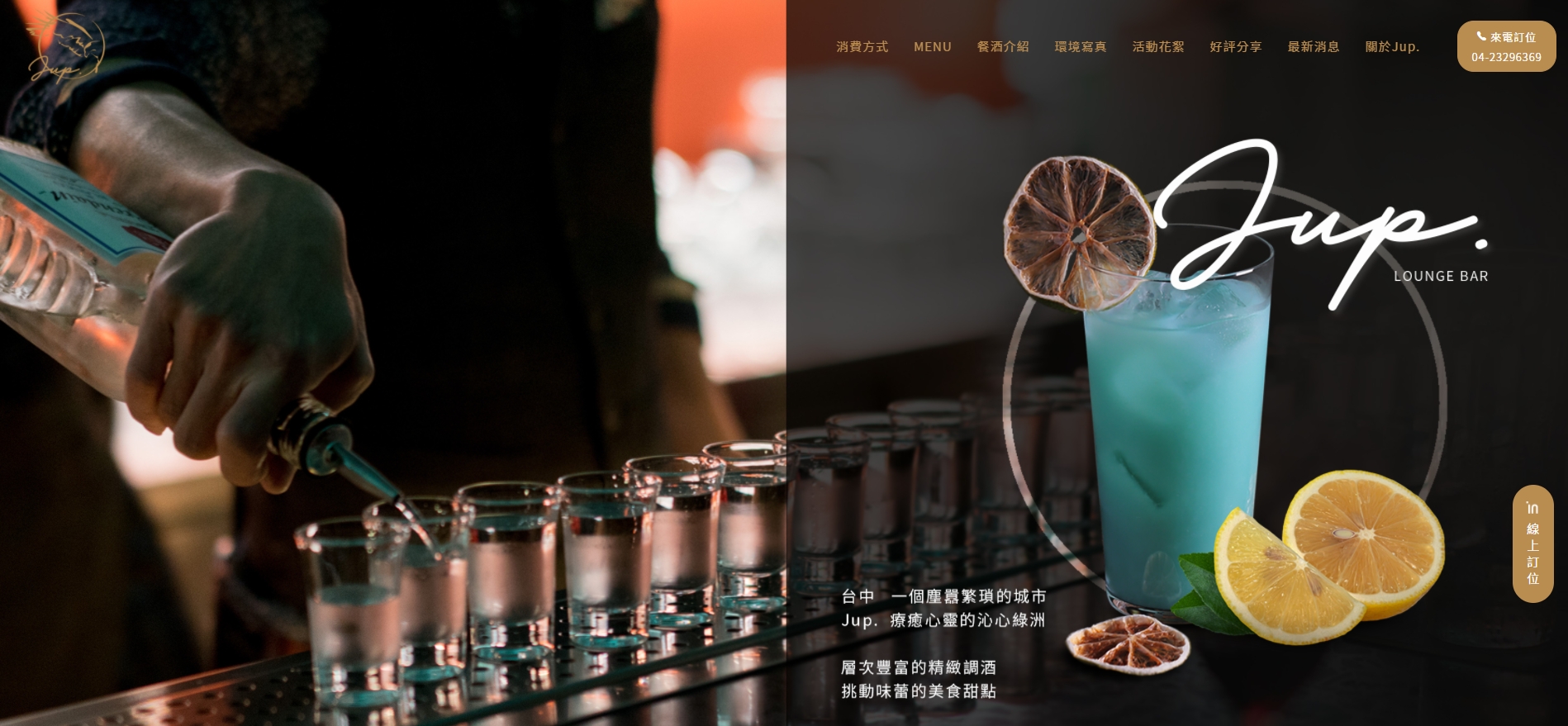 Jup.藉著各樓層不同氛圍的營造,成為酒吧的一大特色,因此,專案經理規劃時,特以樓層為主題區分內容,讓瀏覽者明確了解不同樓層提供的餐點及服務,將優勢明確傳遞,並且創造特殊的瀏覽情境。而為了讓整體網站信賴感提昇,專案經理還加入網美推薦的區塊,分享眾多推薦好評,且將核心理念與初衷完整傳遞。
