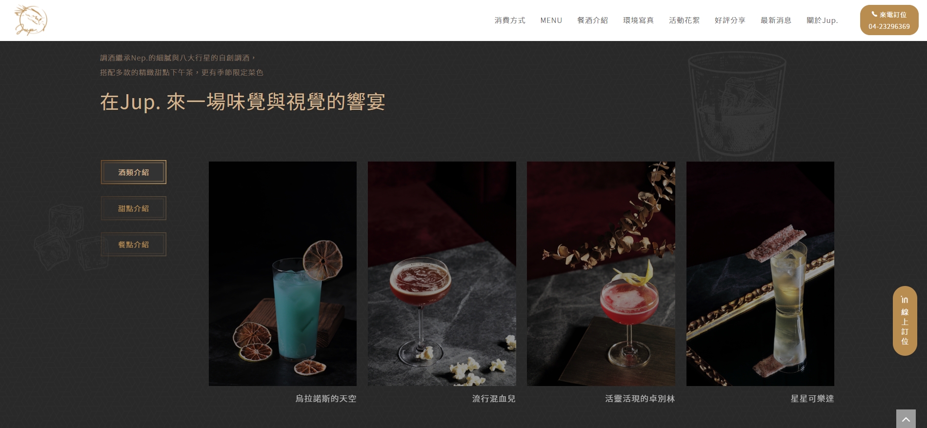 Jup.是姊妹小聚、下班後小酌、情人甜蜜約會的絕佳選擇,啜飲層次豐富的精緻調酒,搭配挑動味蕾的美食甜點,從空間的應用、裝潢的風格,飲品美食的搭配,都能給您全新的體驗。