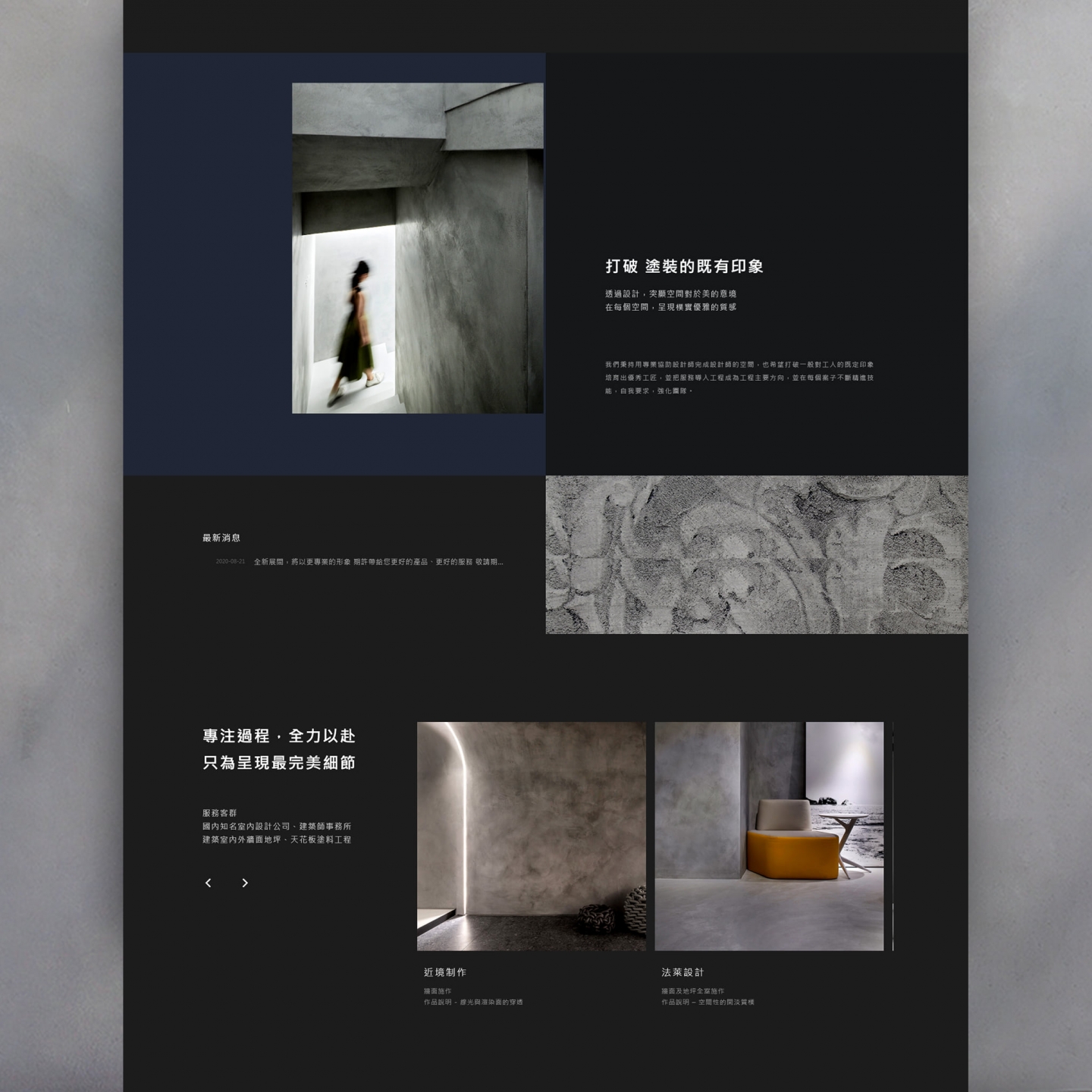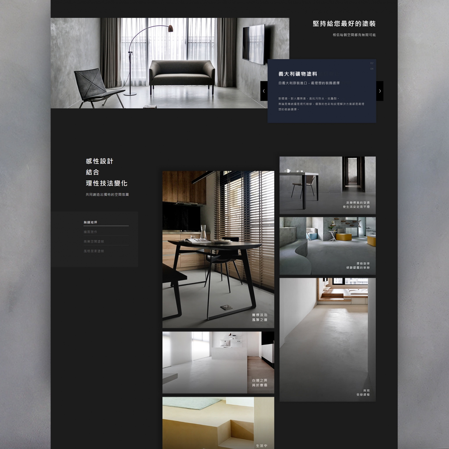 網站規劃時,採空間主題作為分類,讓瀏覽者明確感受,不同塗裝給予空間創造的效果及氛圍,同時為展現優勢,以乾淨大圖呈現細節及技法,將塗裝工藝完美演繹。