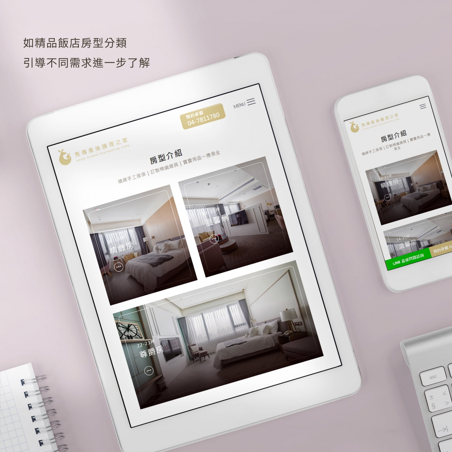 為彰顯產後媽咪能在優雅舒適的環境得到完善休養的重要特色,因此,整體網站運用粉藕色調,營造出明亮輕柔的空間氛圍,並以規劃飯店房型的設計概念,透過空間情境大圖,帶領準媽咪們想像入住後的美好畫面,將服務初衷完整傳達。