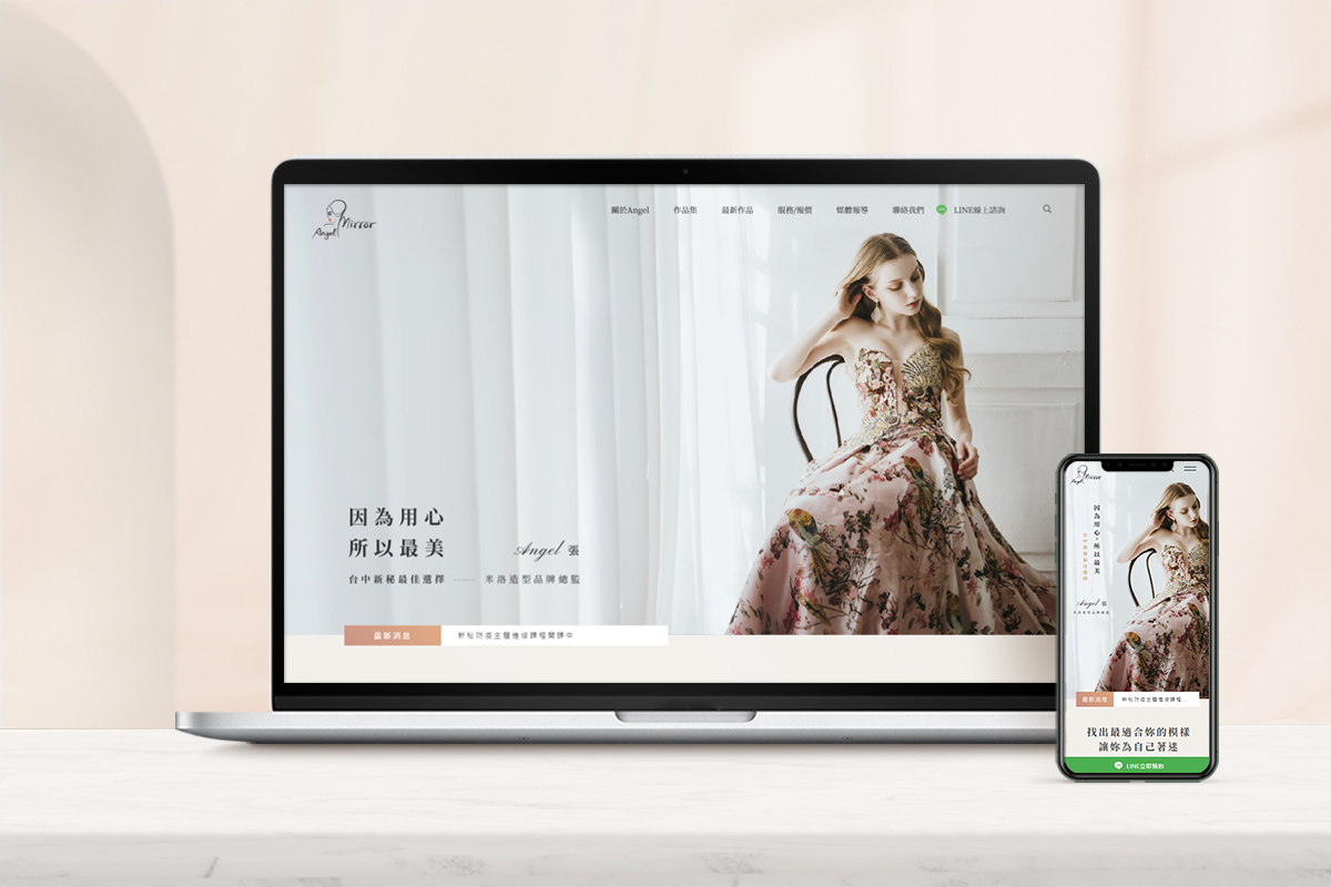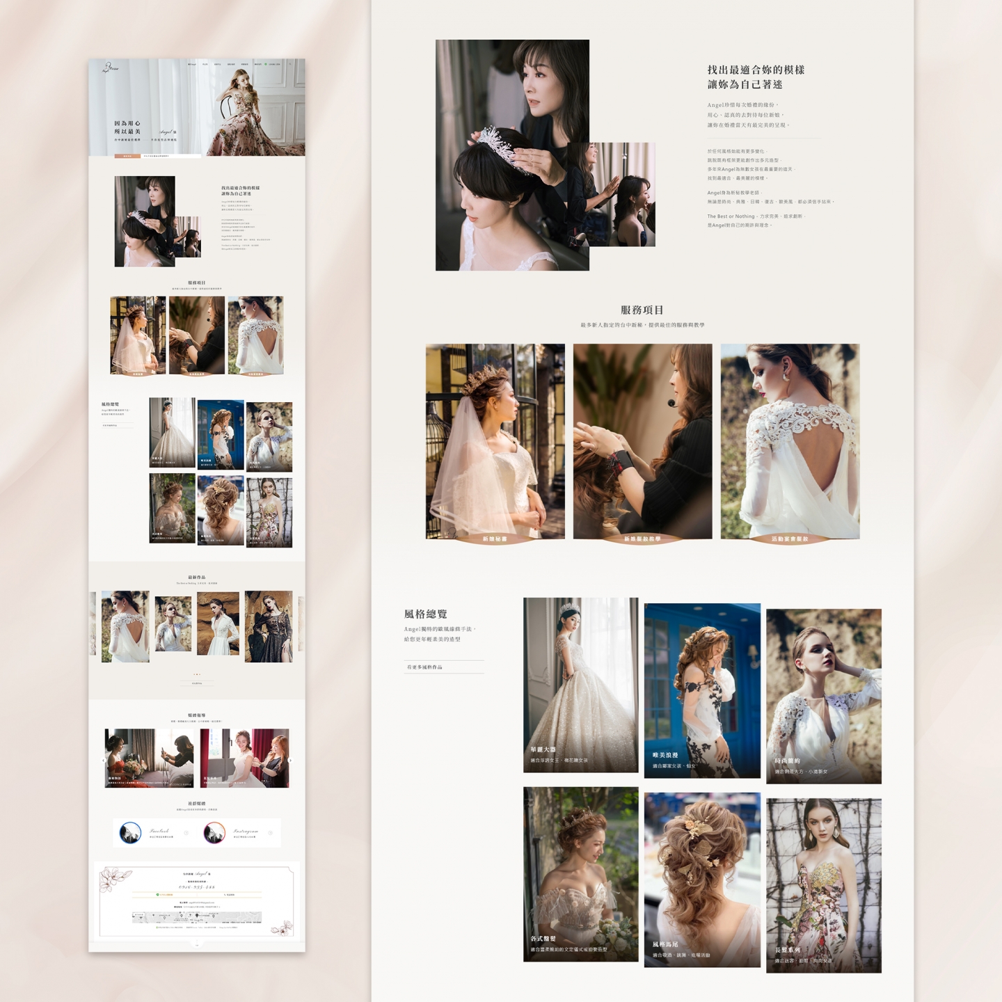 首頁規劃時,首先以感性的文字結合「Angel張」工作側拍照,表現專業親和的服務,提升整體好感度,而色調上運用金粉色系,營造出唯美奢華氛圍,再搭配調性一致的作品照,充份展現「Angel張」一貫的風格調性,將品牌形象完美詮譯。