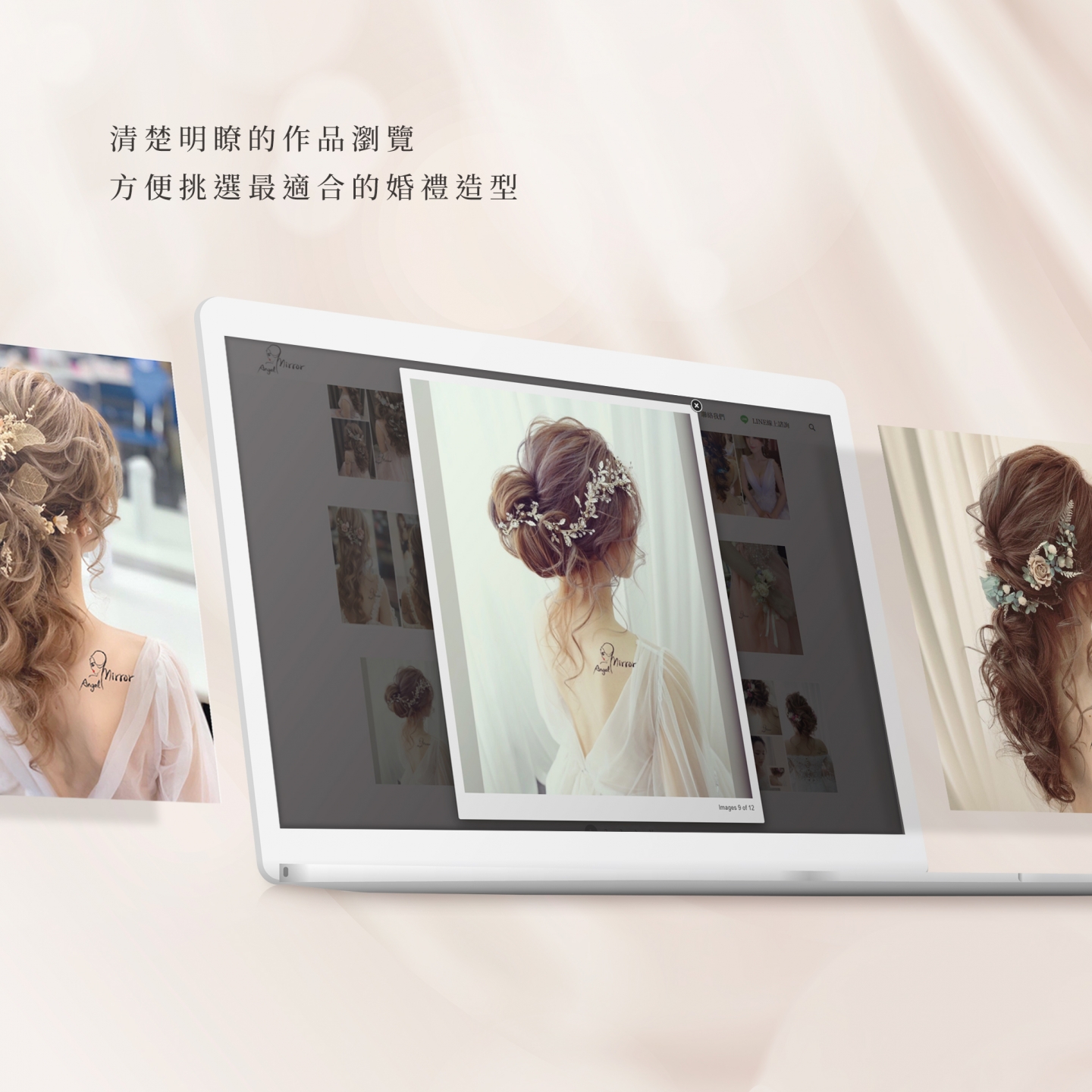 同時在作品介紹區塊中,採不同的造型風格以區分內容,並貼心的使用文字內嵌於圖片的手法,不僅讓準新娘方便查找心中理想造型,更使畫面簡潔優雅,加上婚卡形式的頁尾設計,增添網站浪漫典雅的視覺感受 !