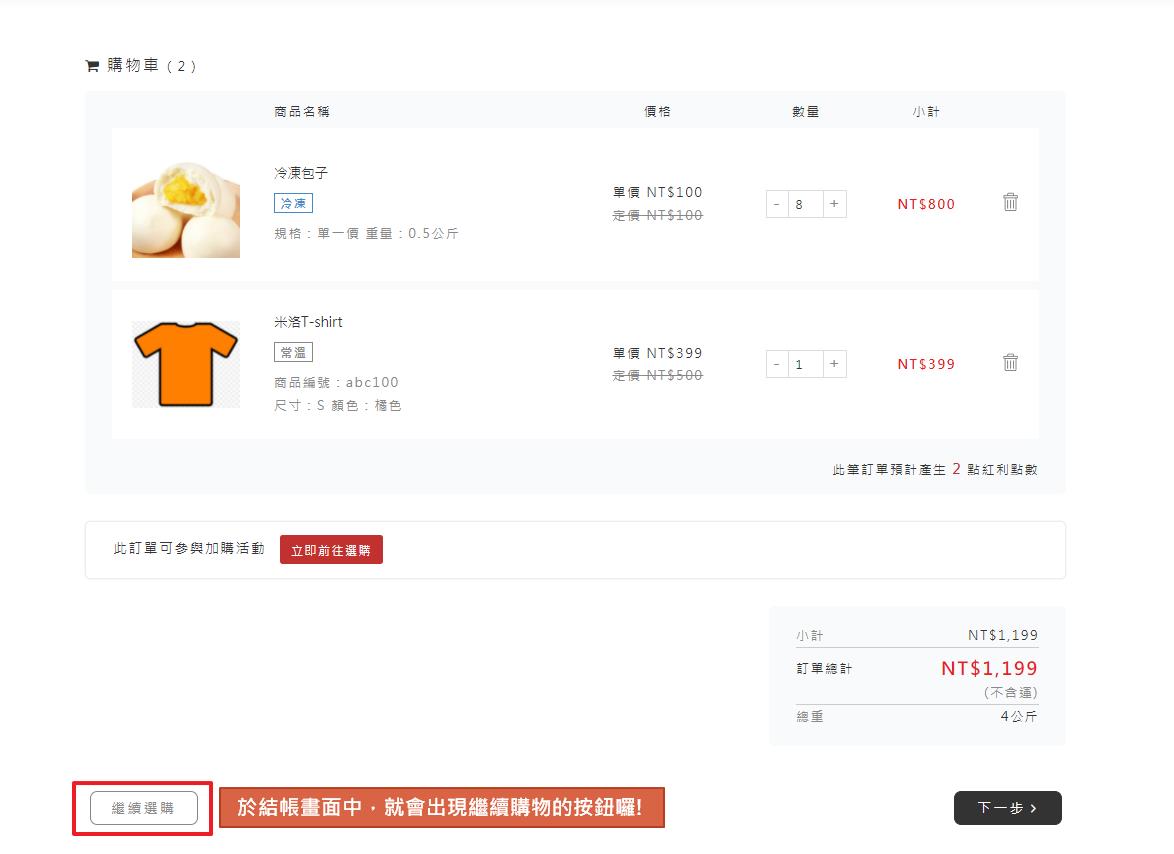 此按鈕位置為結帳流程中,可點選繼續購物按鈕,回到您設定的連結導向(通常會將連結設定回到產品頁),下面我們就來看看如何設定吧!