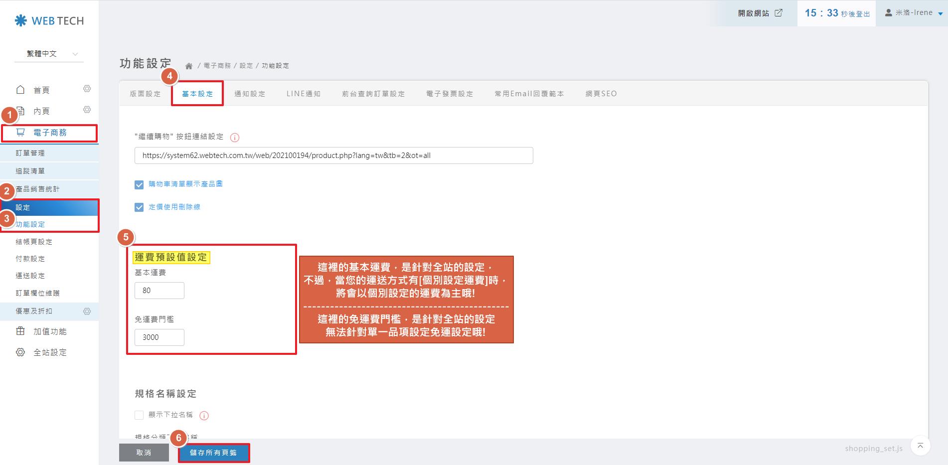 點擊電子商務>設定>功能設定>基本設定頁籤