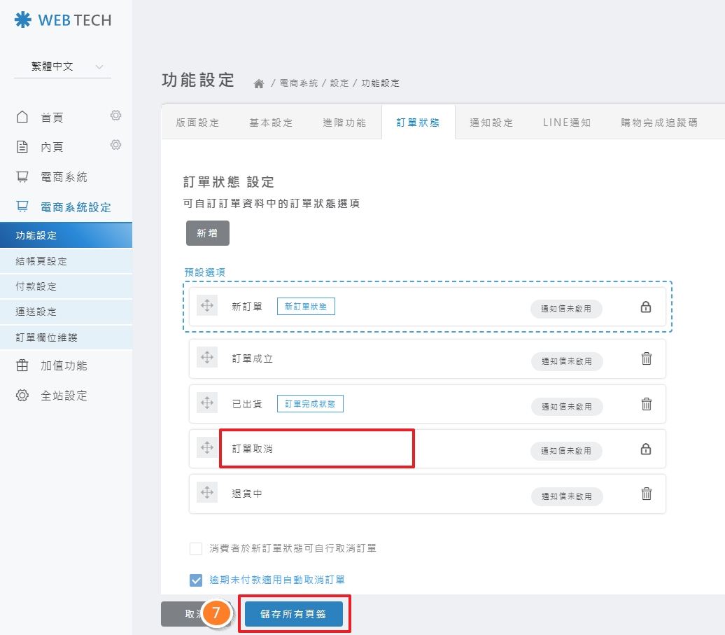 電子商務設定 > 功能設定 > 訂單狀態,點擊【取消訂單】