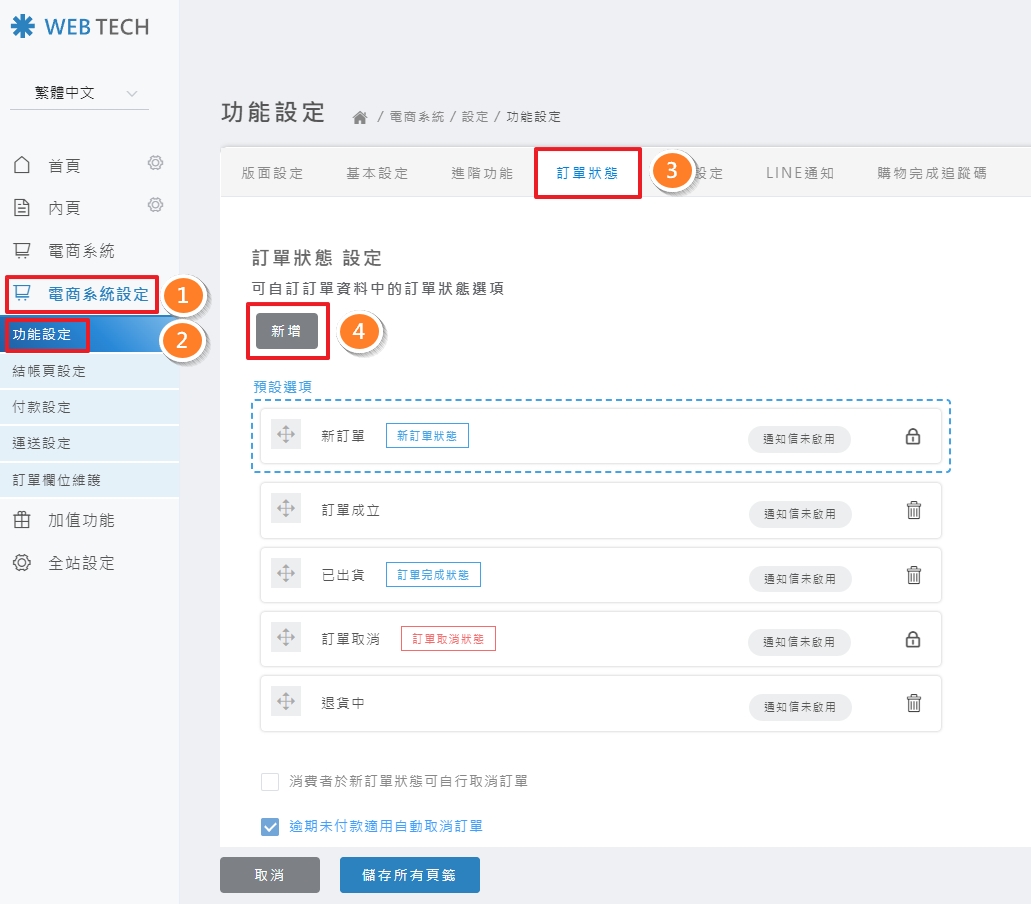 電子商務設定 > 功能設定 > 訂單狀態,點擊【新增】