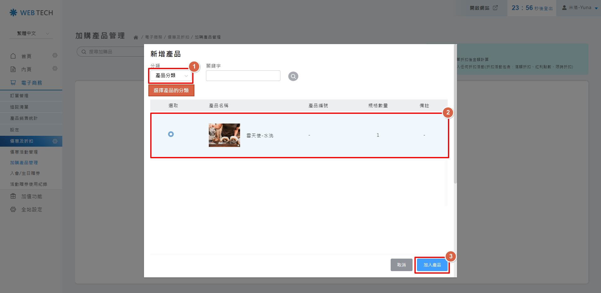 新增加購品,選擇主產品分類,並點選需加購之商品,點選【加入產品】