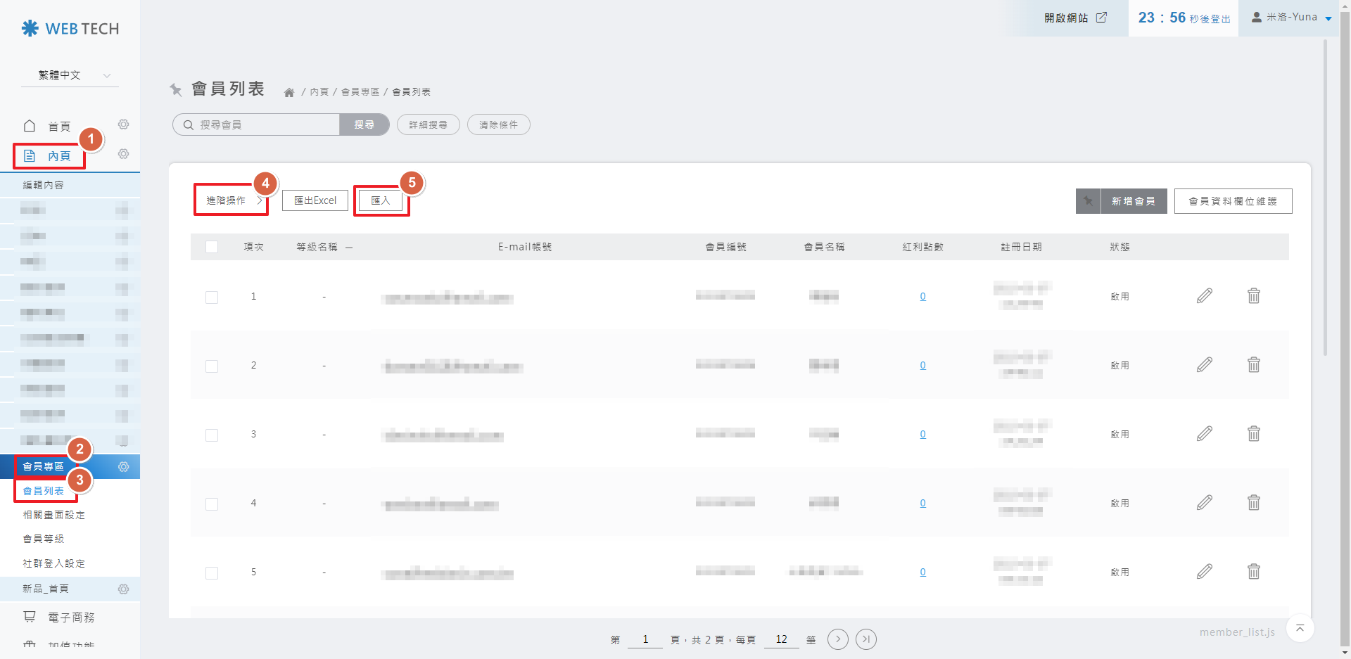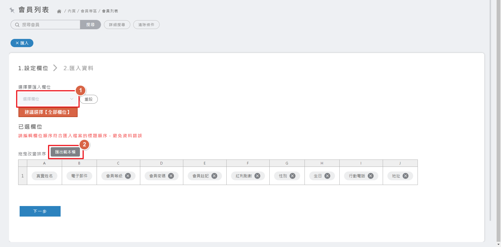 「內頁」>「會員專區」>「會員列表」,[進階操作]→點擊【匯入】