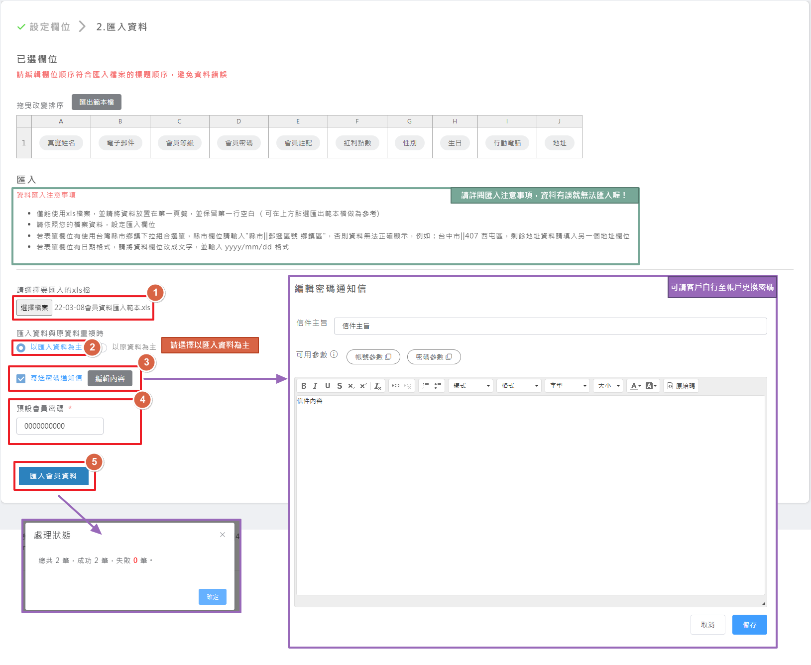「匯入會員資料」→會顯示失敗或是成功的提示