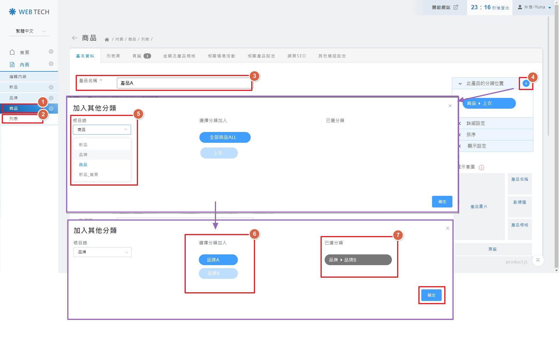 當您網站產品的架構樹狀圖出來(如下圖),發現想要在不同資料夾內有相同資料顯示,或是某個商品適用不同分類, 這時就可以使用【其他分類設定】,去增加產品的分類位置喔! 位置:產品頁>此產品的分類位置 這樣前台【商品>上衣】內,和【品牌>品牌A】的資料夾都會有商品頁,但後台只要編輯一個地方就可以囉!!! #其他方類