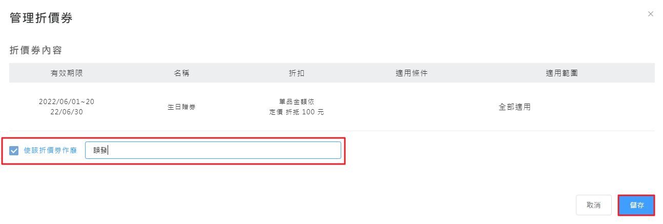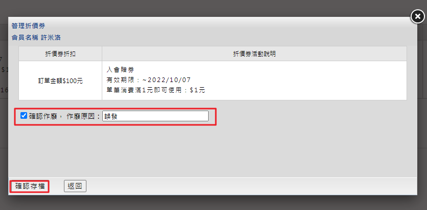 Step3.在跳出的管理折價卷小視窗,勾選「使該折價券作廢」 ,並備註作廢原因儲存即可完成唷。