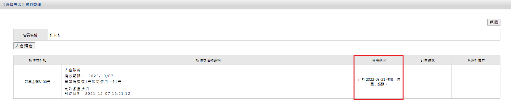 ※系統會於[使用情形]欄位,記錄此張折價券的使用狀況/作廢原因。