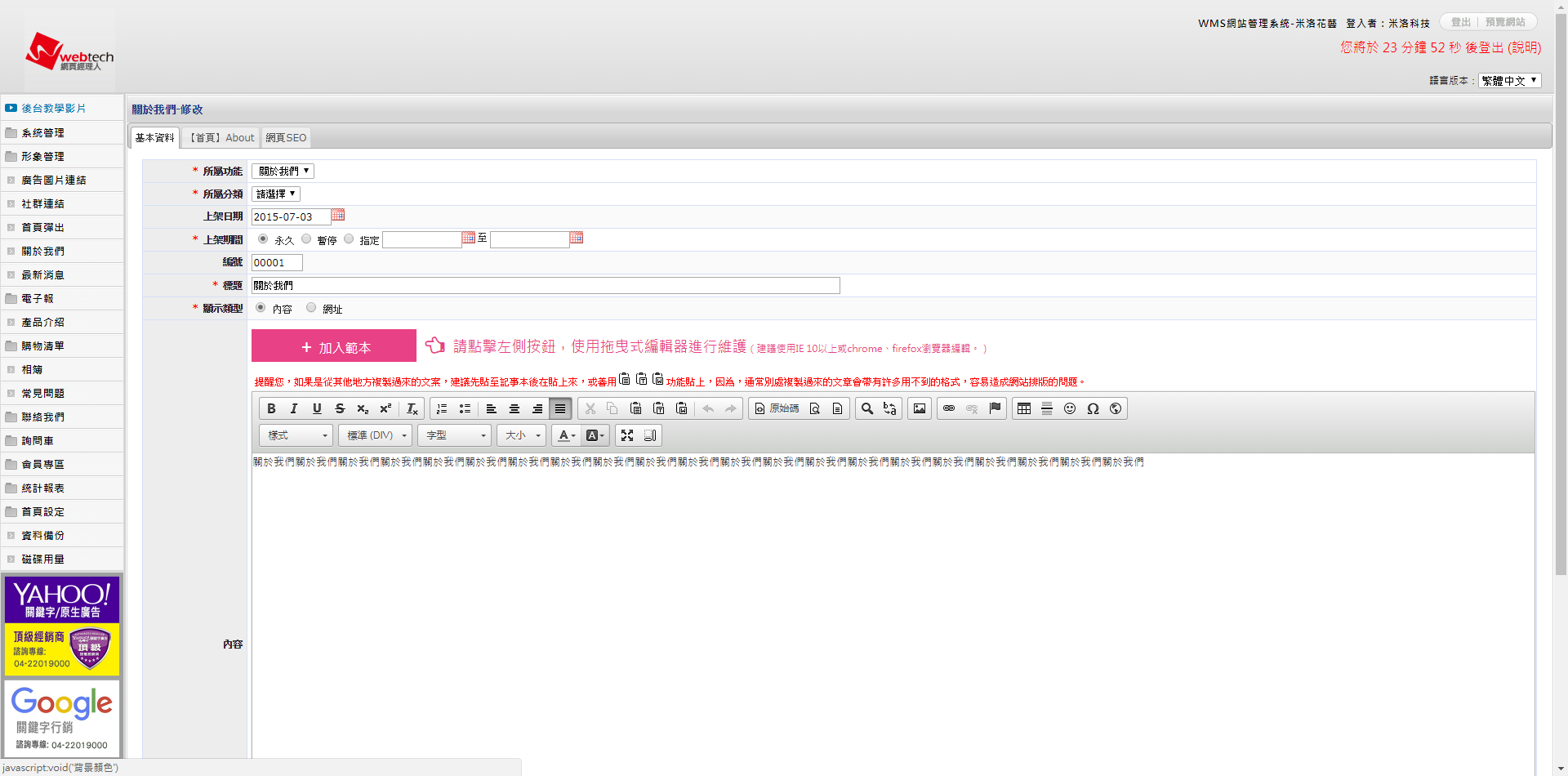 Step1 操作-編輯、複製 Step2 上傳圖片 Step3 超連結 Step4 表格 Step5 加入範本 〈若貴公司無美工人員,可至編輯器內點選”加入範本”鈕,操作方式請參考:拖曳式編輯器〉 Step6 連結 點此即可查看前台對應畫面 功能說明 - 文章列表 ↓ 功能說明 - 產品介紹 ↓
