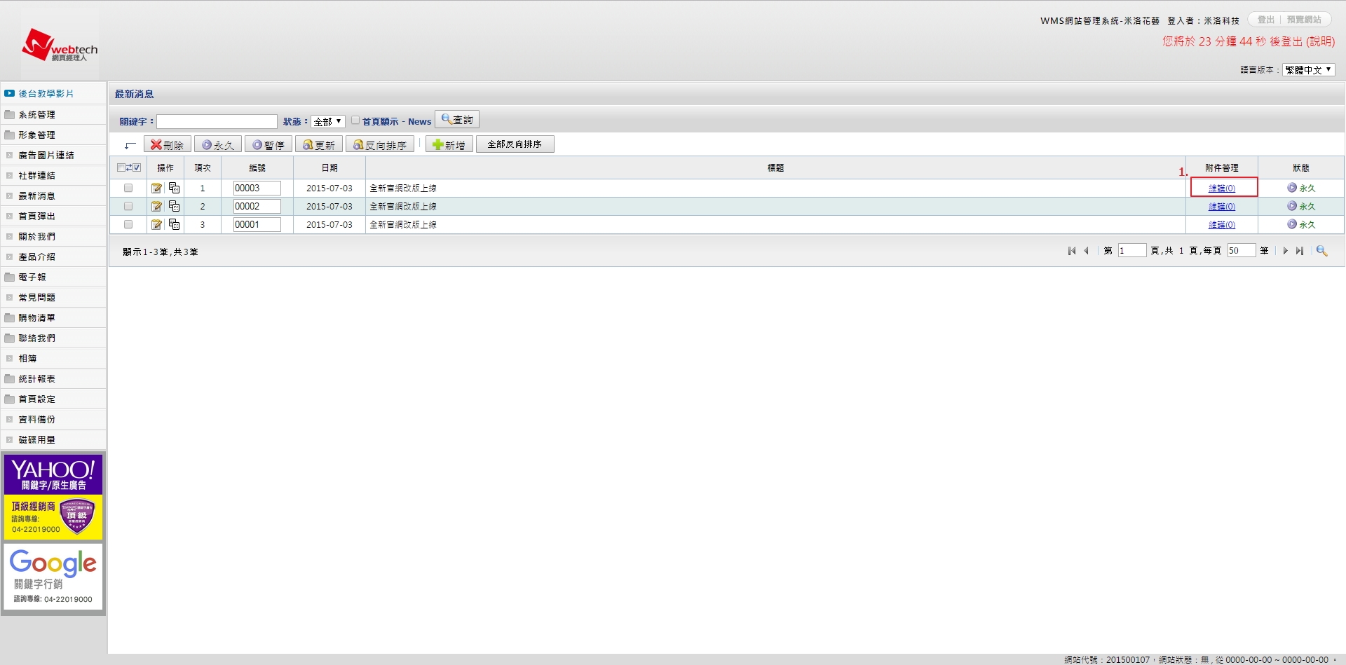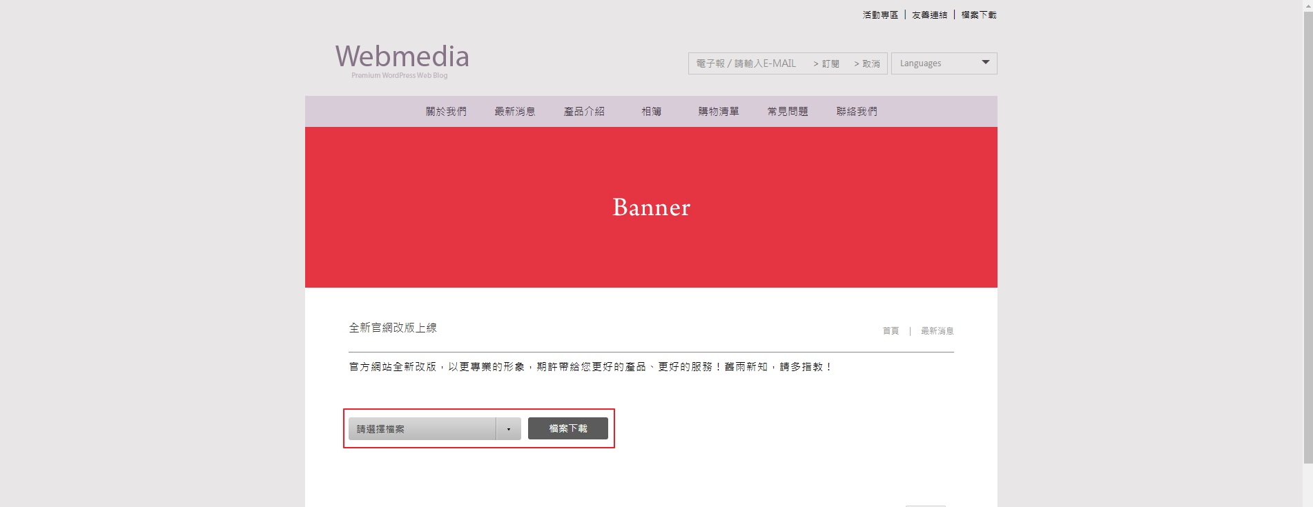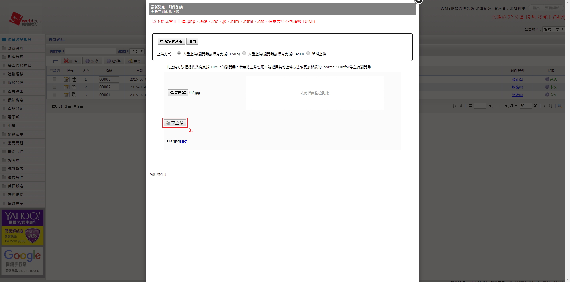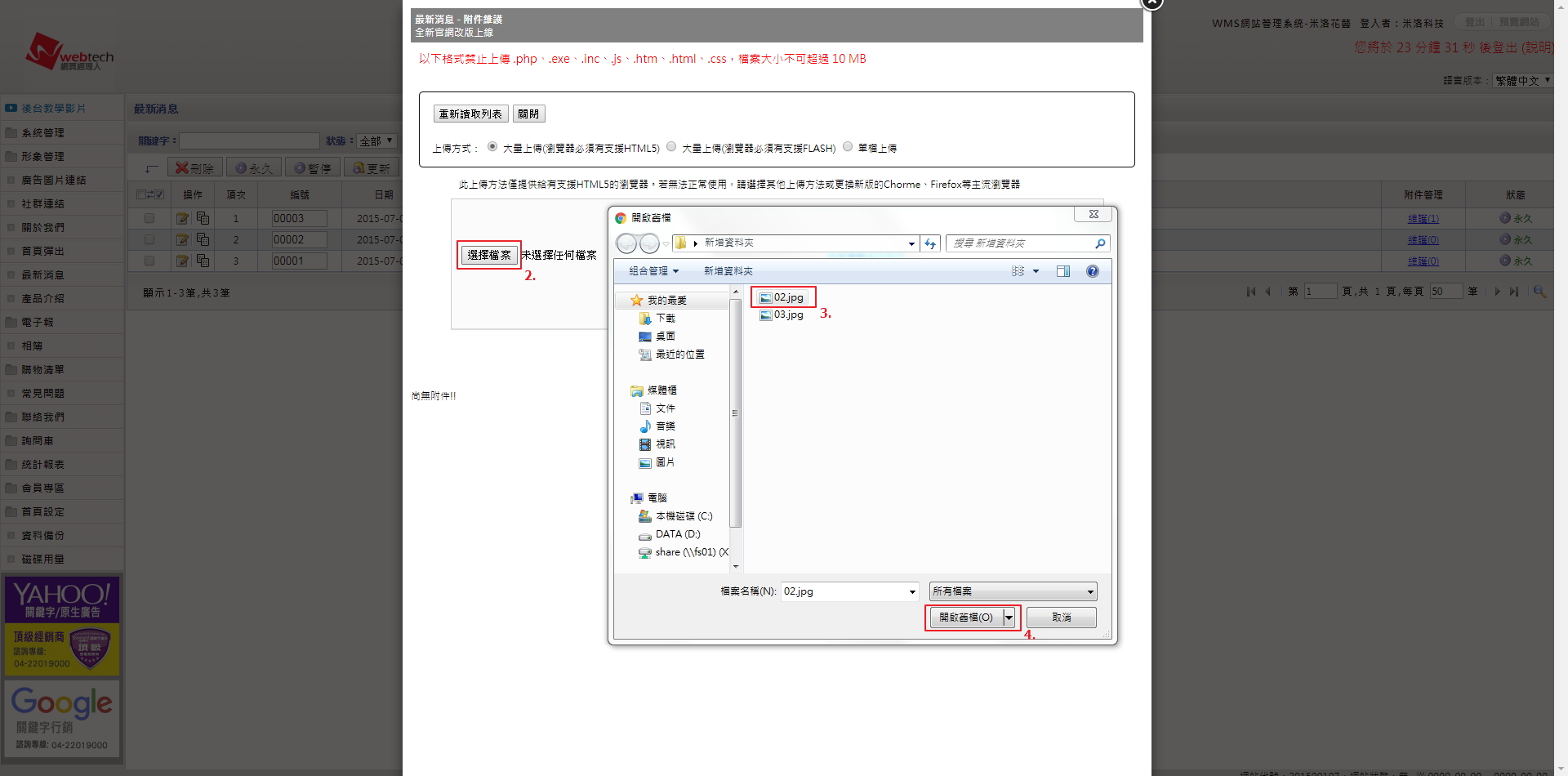 Step 01 點選右側附件管理「維護」 Step 02 選擇檔案 Step 03 選取欲上傳的檔案 Step 04 開啟舊檔 檔案格式禁止上傳 .php、.exe、.inc、.js、.htm、.html、.css,檔案大小不可超過 10 MB Step 05 確認上傳即可 設定完成畫面