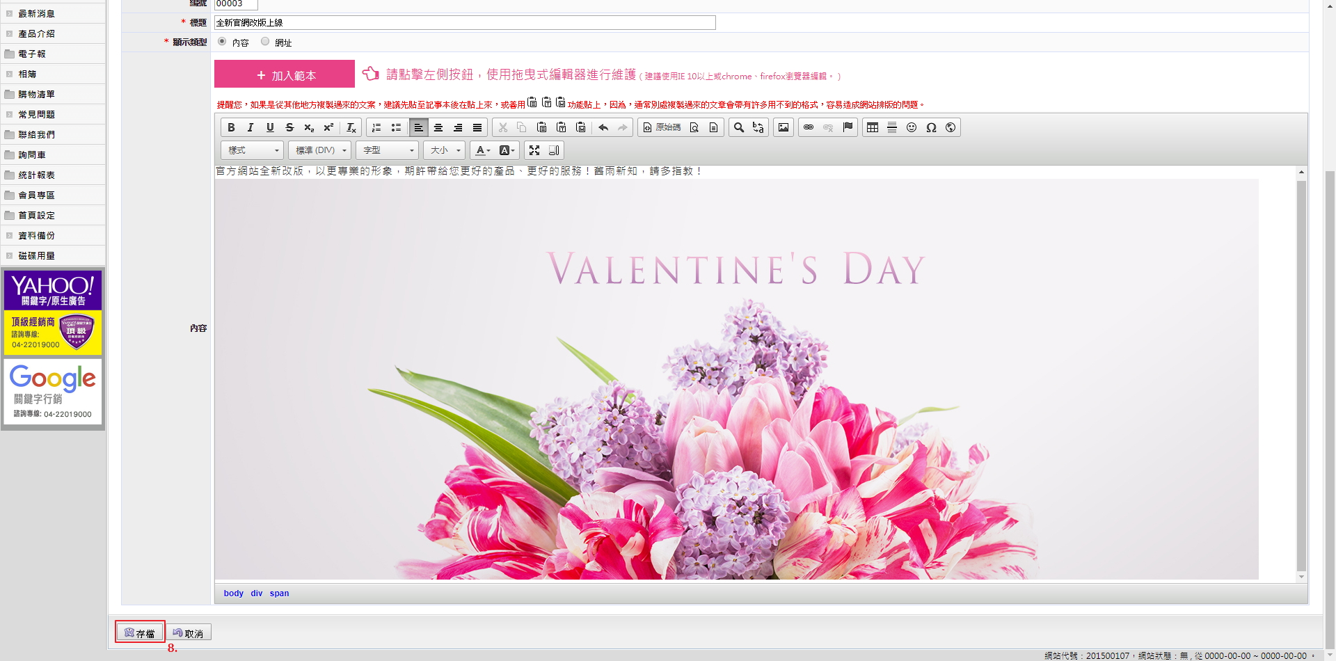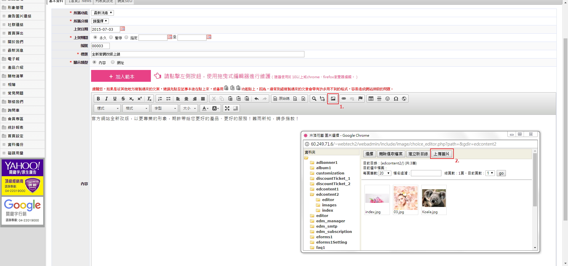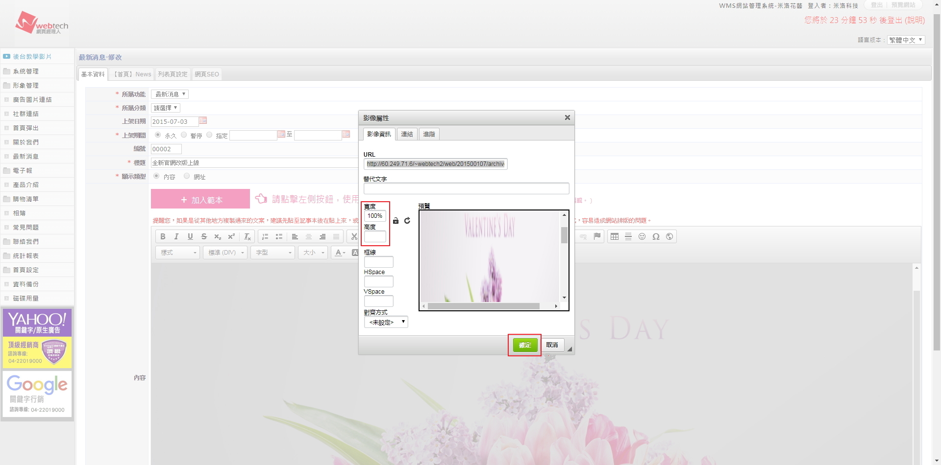 滑鼠左鍵點選該圖兩下會顯示「影像屬性」視窗,即可調整寬/高,建議圖片寬度調整為100%,高留白