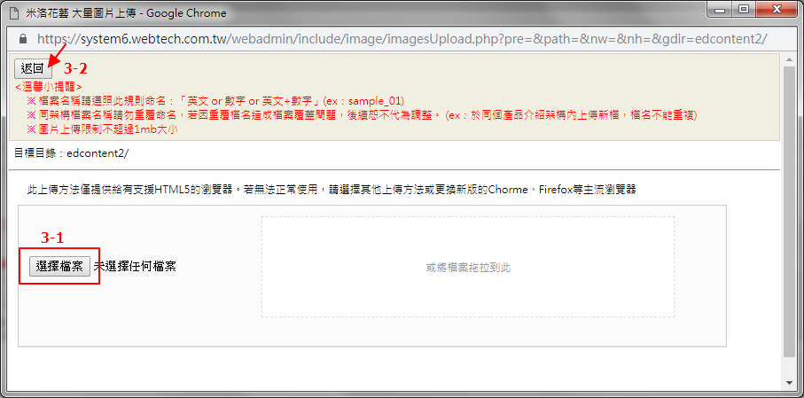 選擇「選擇檔案」並選取欲上傳圖片後,再點選「返回」
