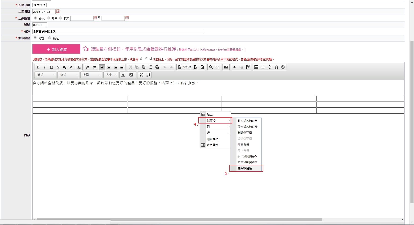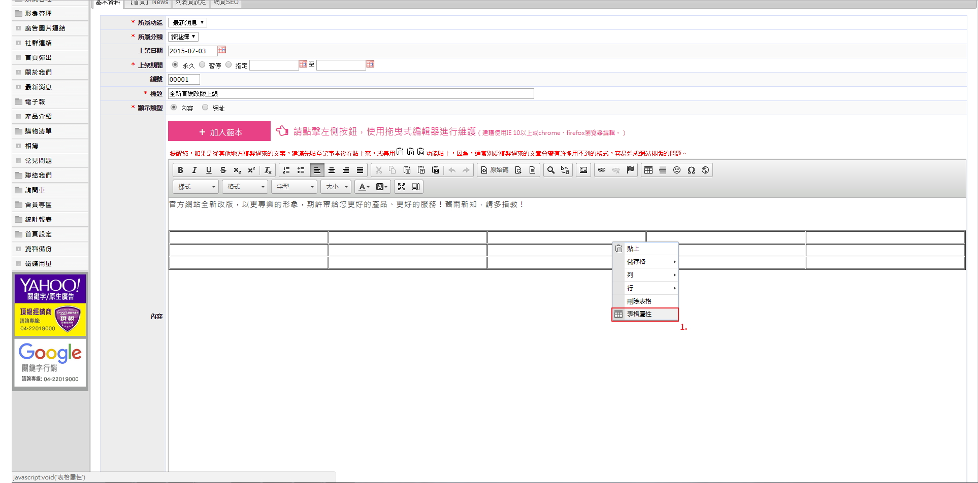 於欲修改的表格按滑鼠右鍵,點入「表格屬性」