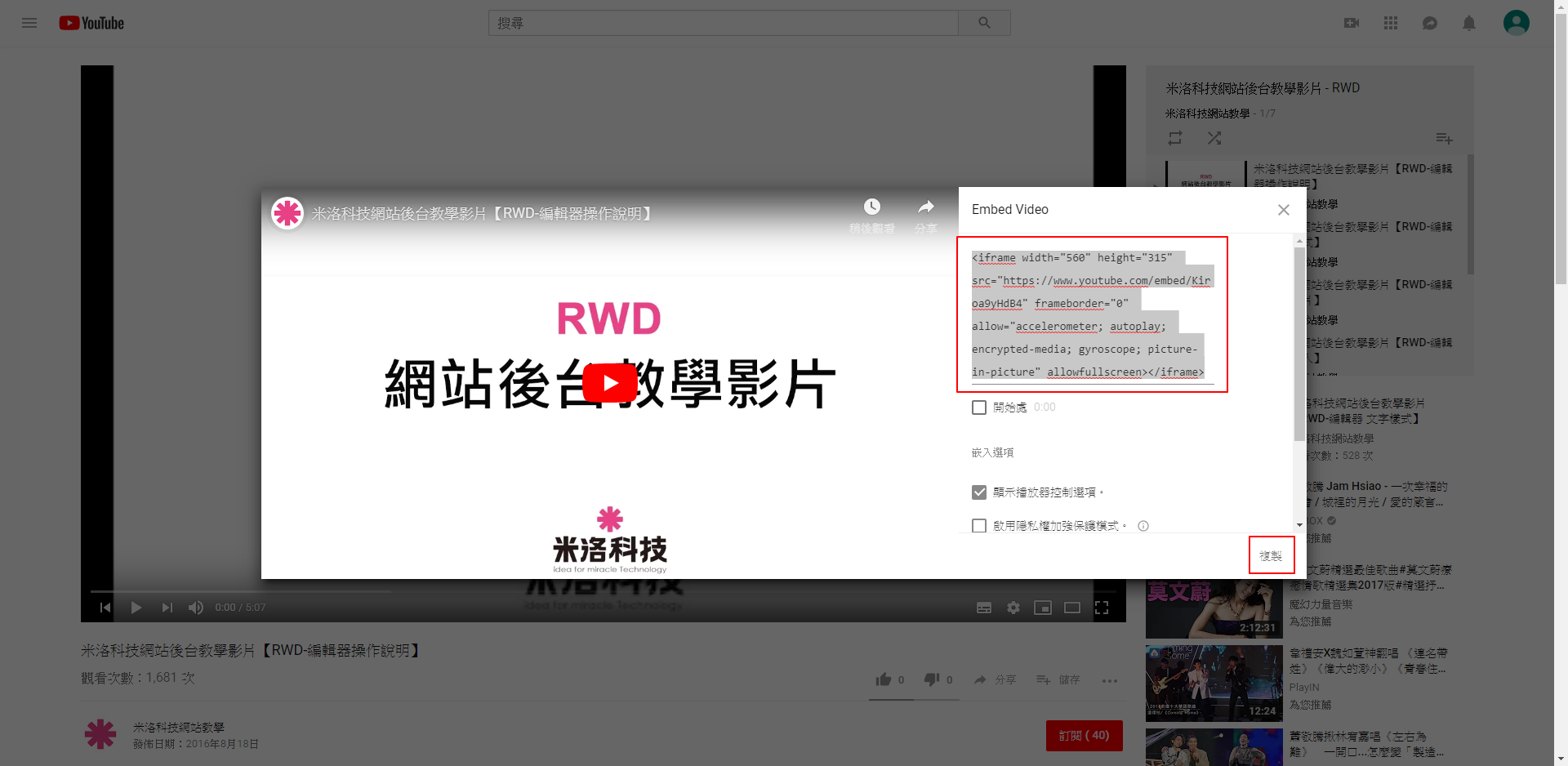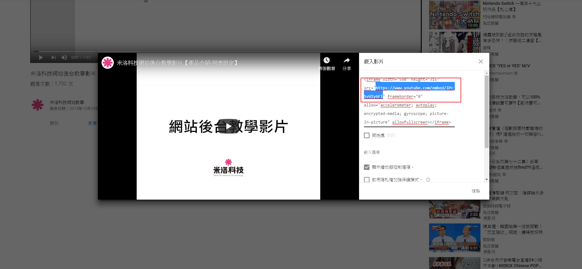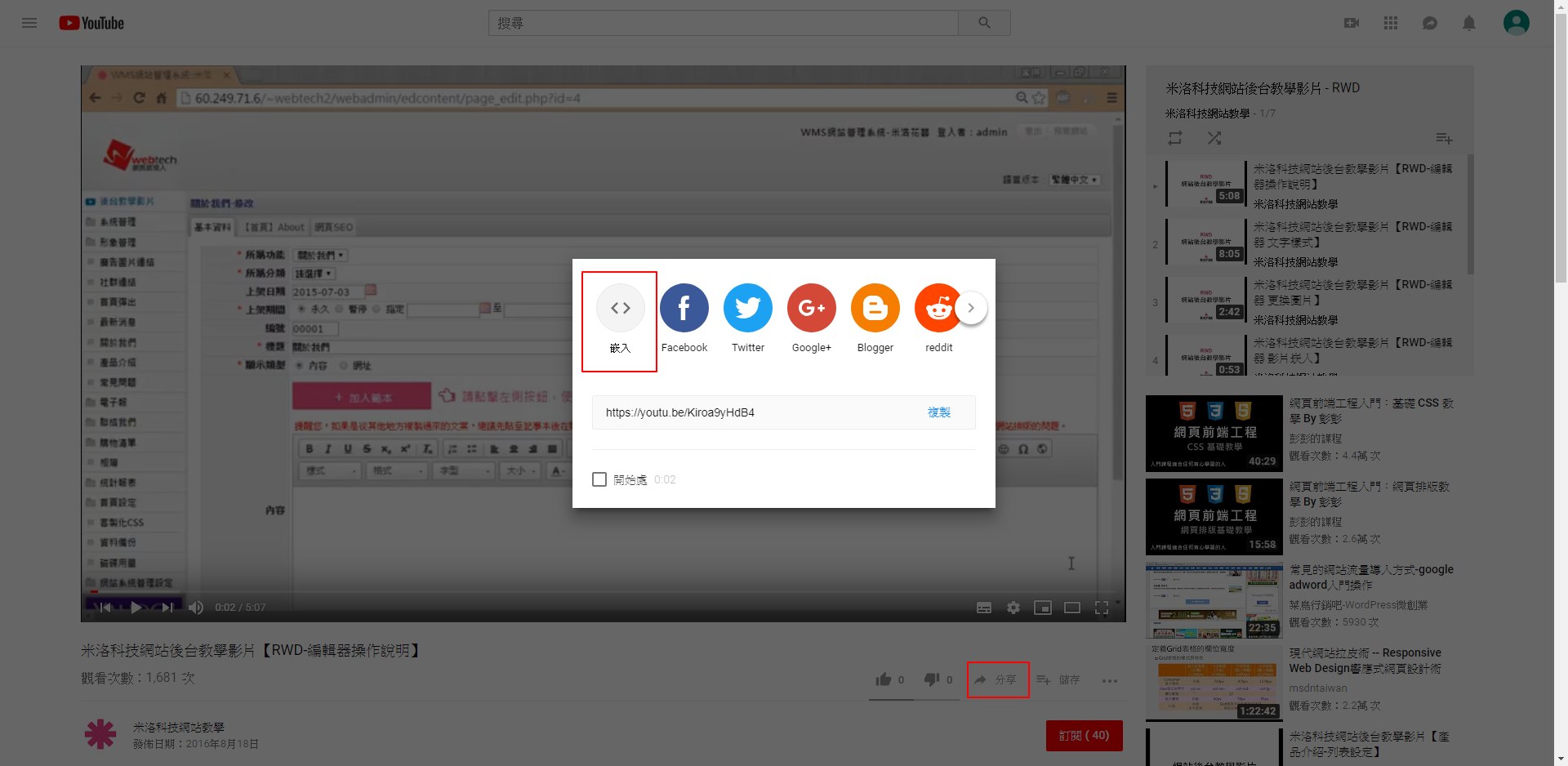 故,會建議各位可先將影片上傳至影音平台(例如:youtube、vimeo...等),再使用語法的方式嵌入網站唷!