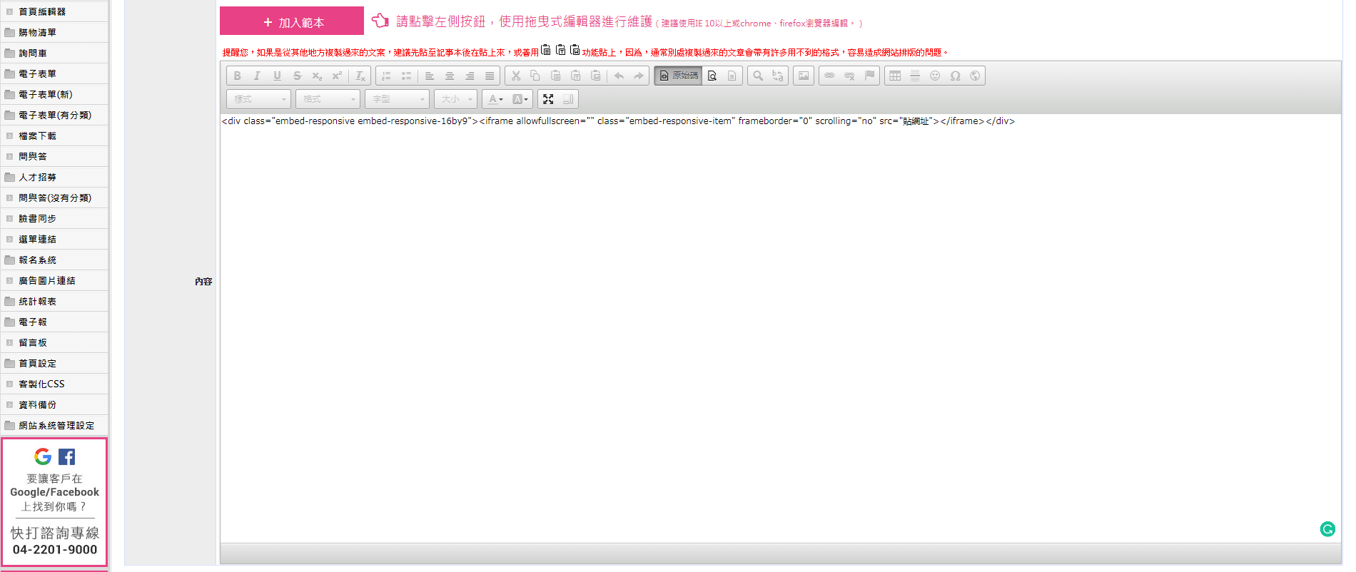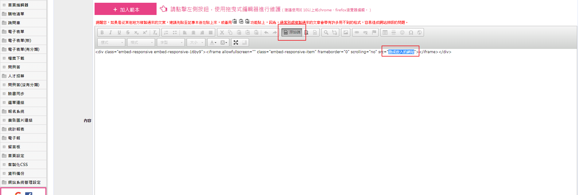至後台要上傳影片的編輯器內,點選「原始碼」