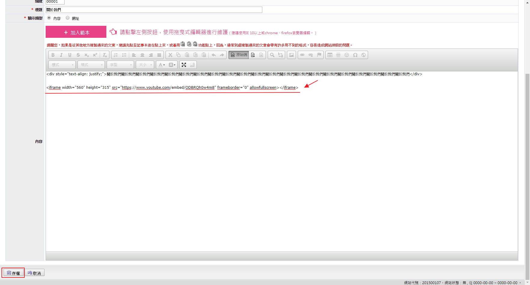 於原始碼頁面,按CTRL+V(或按右鍵貼上),將剛才複製的影片語法貼至空白處,並點選存檔