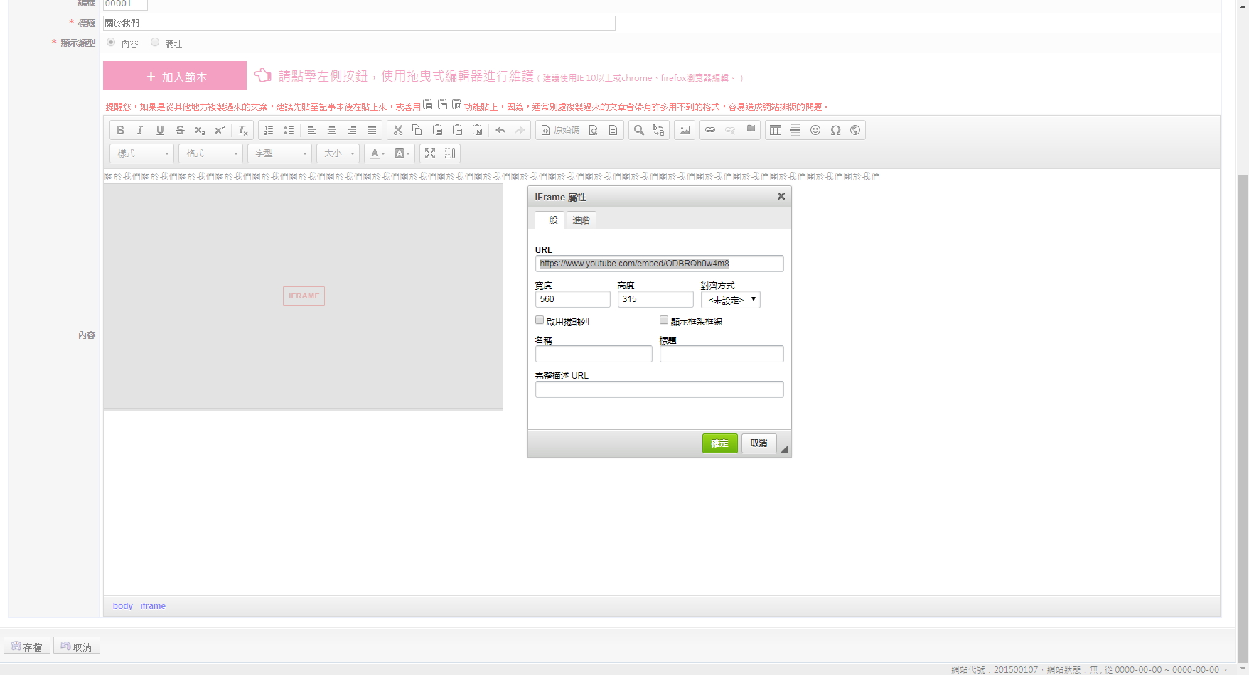 若需調整影片大小,再點一次原始碼功能,回到編輯器後,左鍵點兩下會出現「IFrame屬性」區塊,可於此調整影片寬度及高度