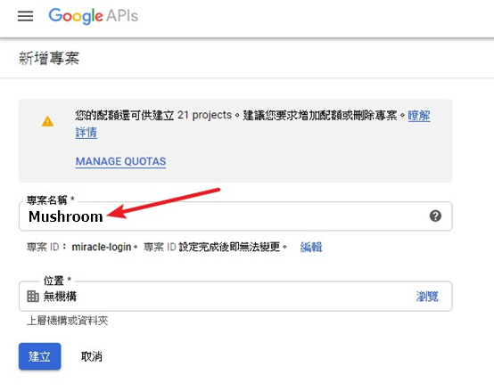 STEP 2:點選「建立專案」,請設定一個專案名稱(僅能英文)(僅供自己辨識用),按下「建立」
