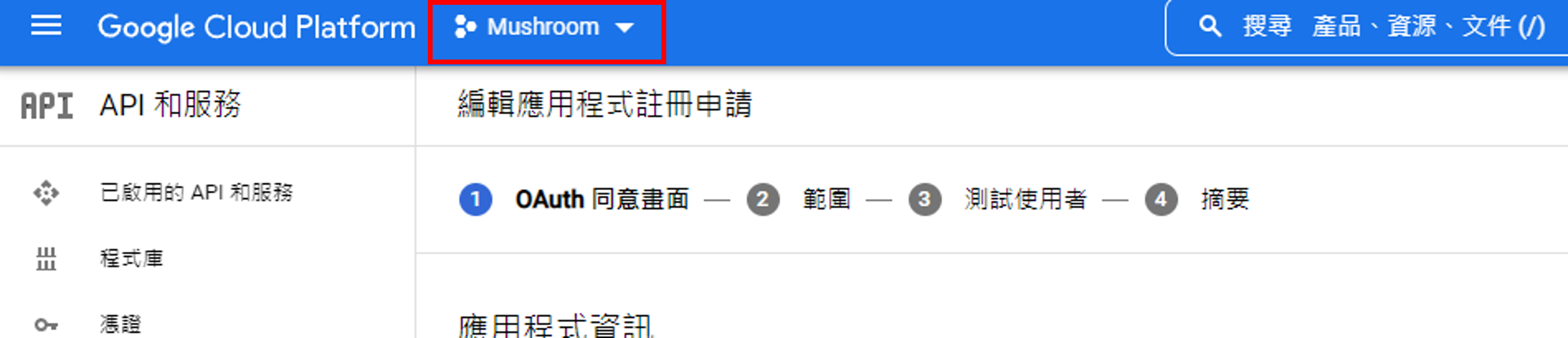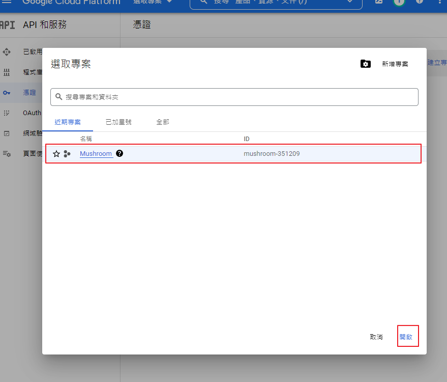 STEP 3:確認左上角的專案名稱已切換成所建立的專案若沒有自動切換,請手動切換到正確的專案點選「憑證」>「選取專案」>選取您所建立的專案名稱>開啟