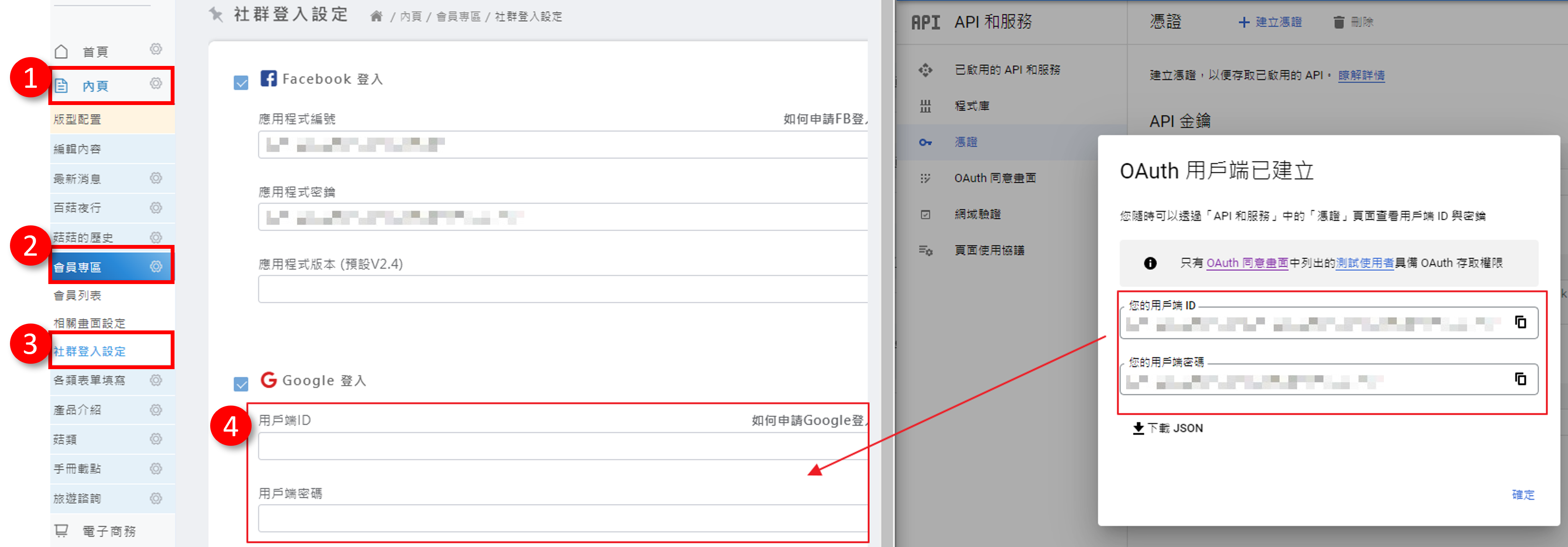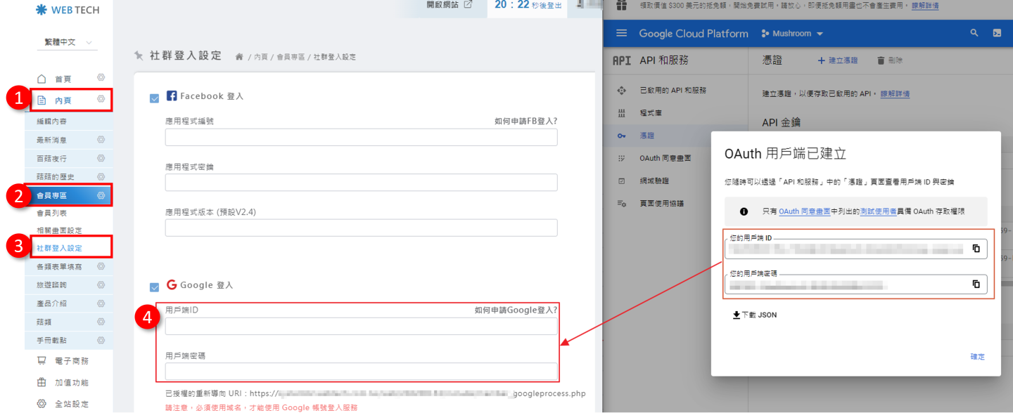 STEP 8:將用戶端ID與密碼貼到網站後台將用戶端ID與密碼複製 > 到網站後台「會員專區」>「社群登入設定」> Google 登入區塊> 貼上用戶端ID與密碼 > 儲存