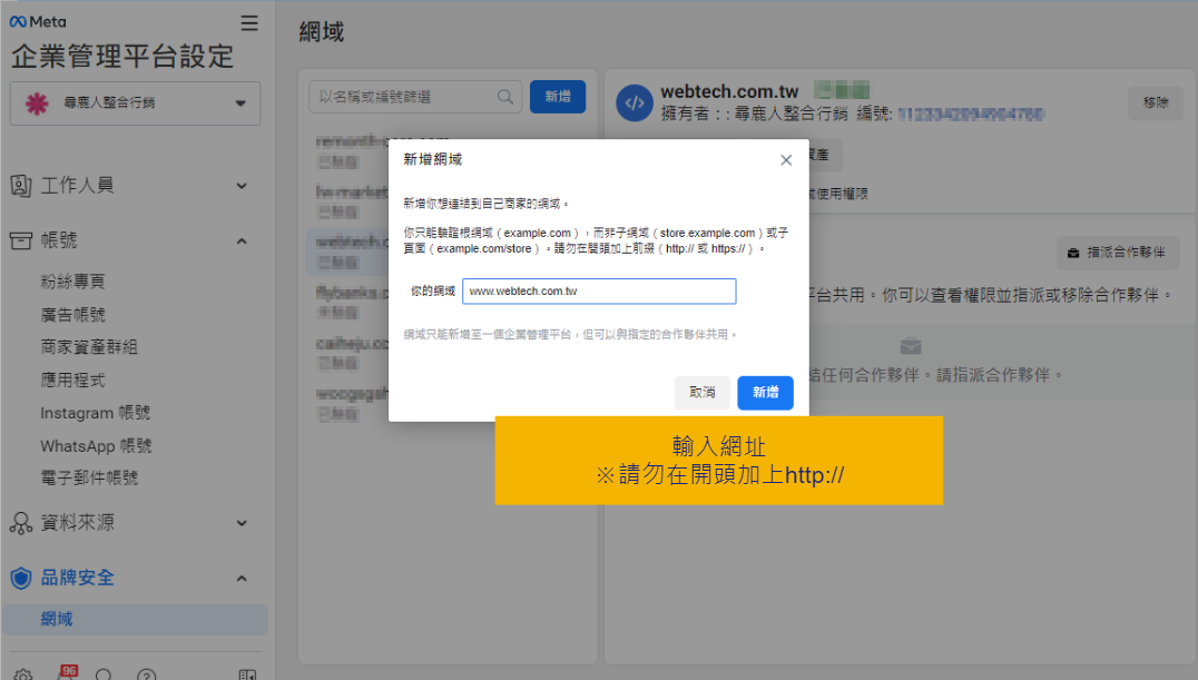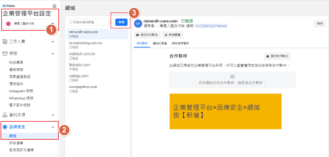 Step 1 企業管理平台 → 品牌安全 → 網域 點選【新增】