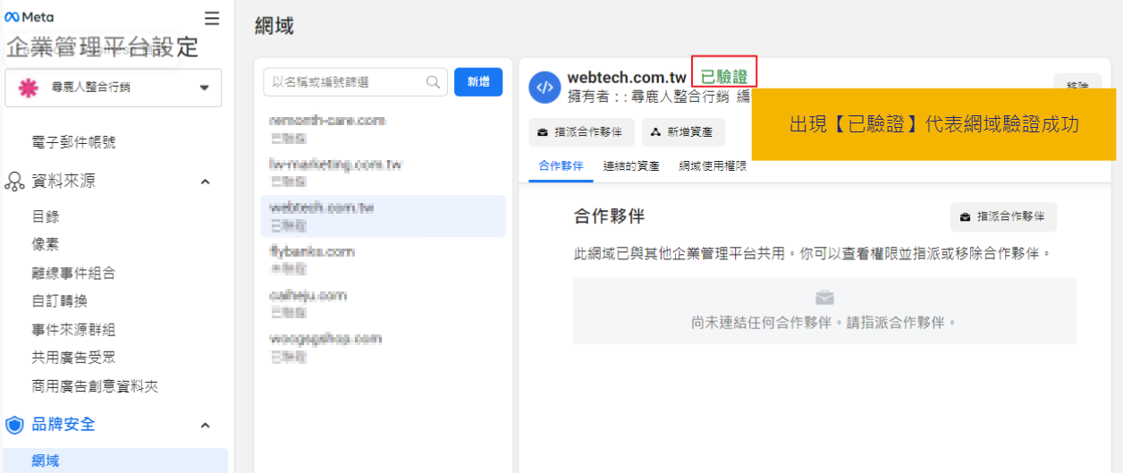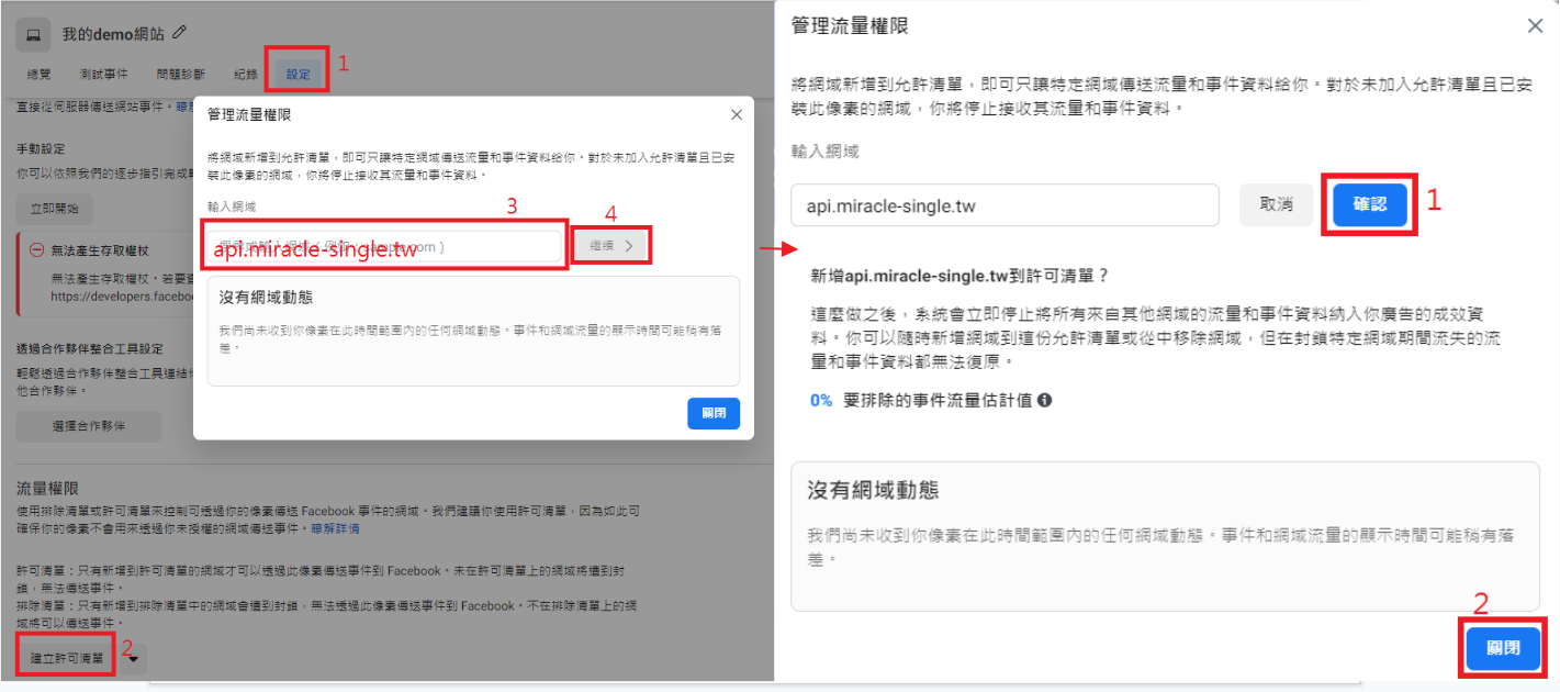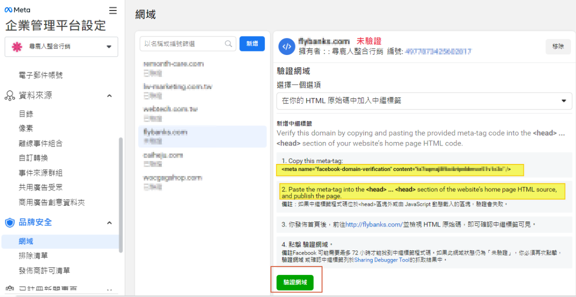 ※未驗證網域也可以成功顯示伺服器事件,但操作過程FB會提示需要驗證,以下為臉書驗證網域的流程。