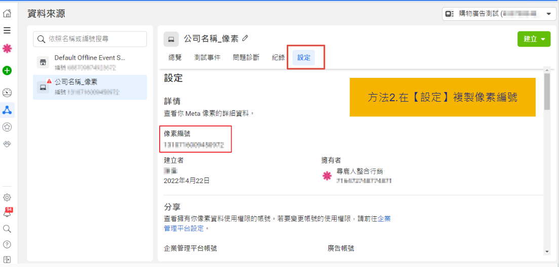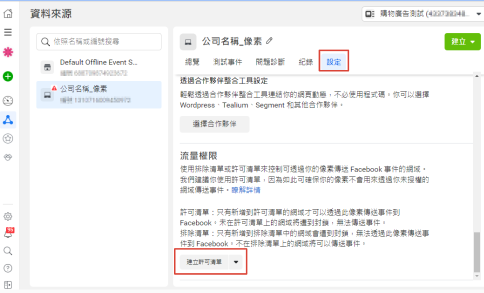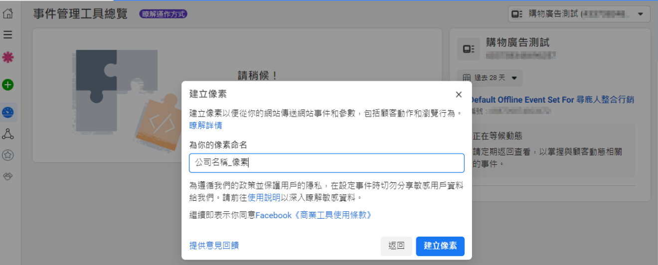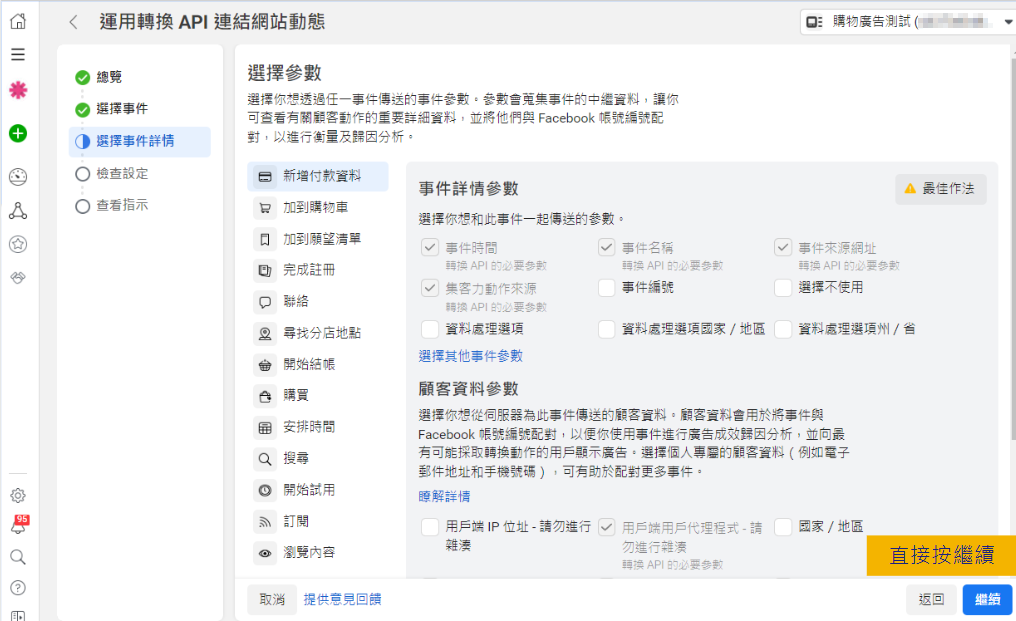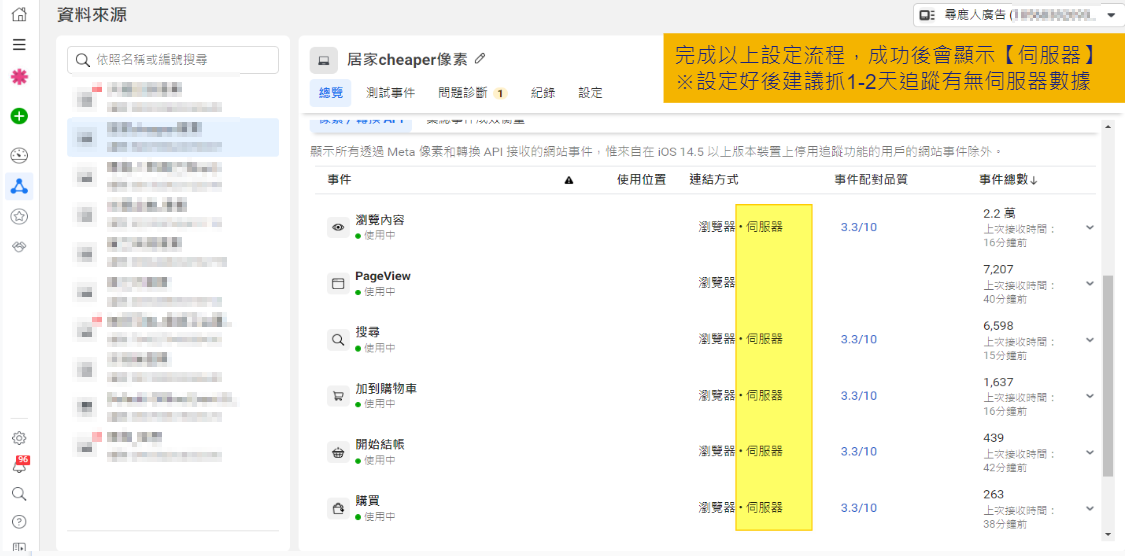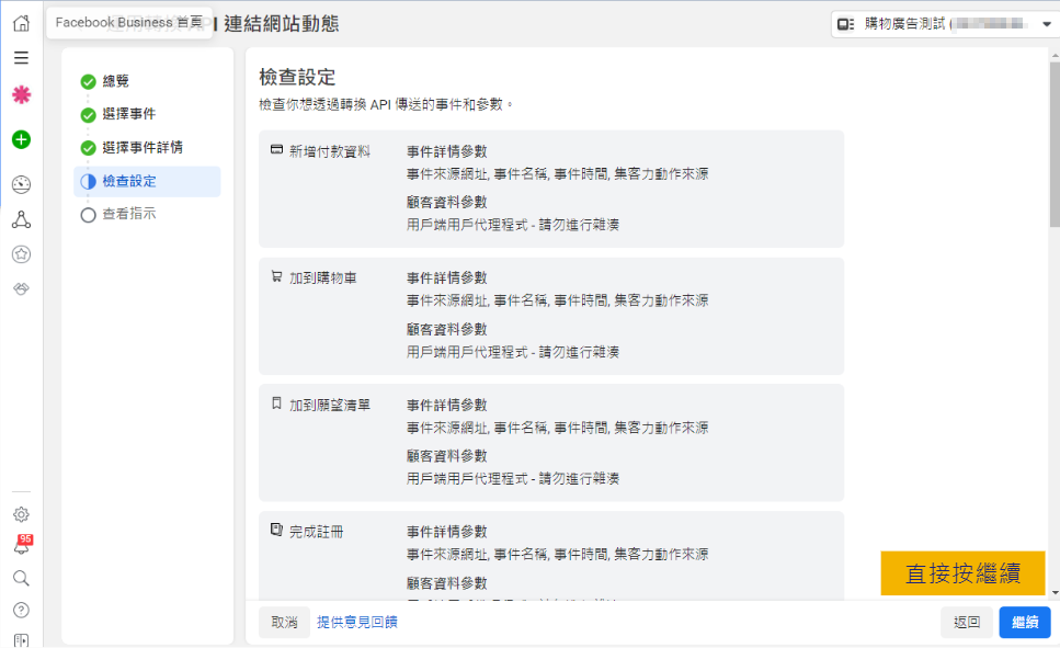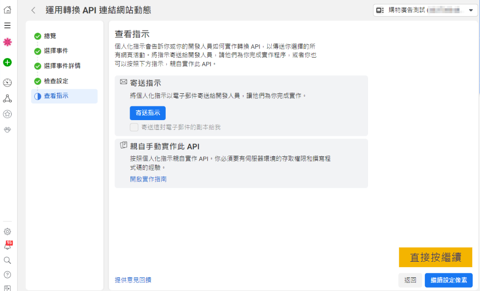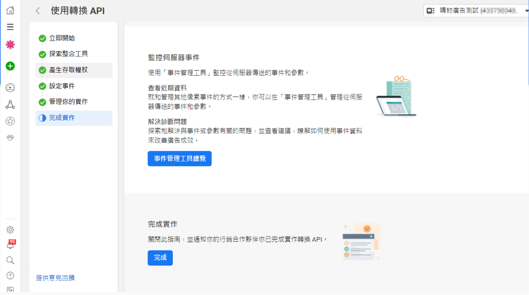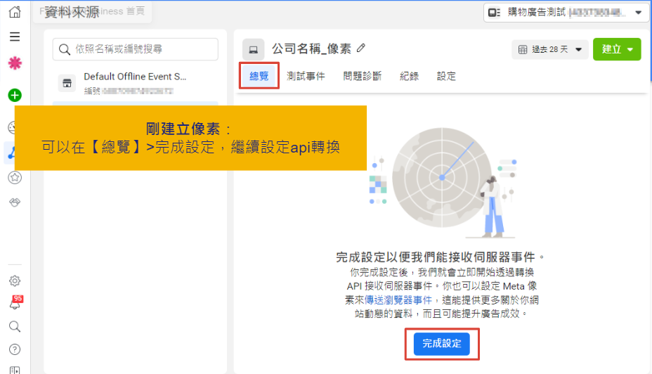 - 剛建立像素:可以在【總覽】→ 完成設定,繼續設定api轉換