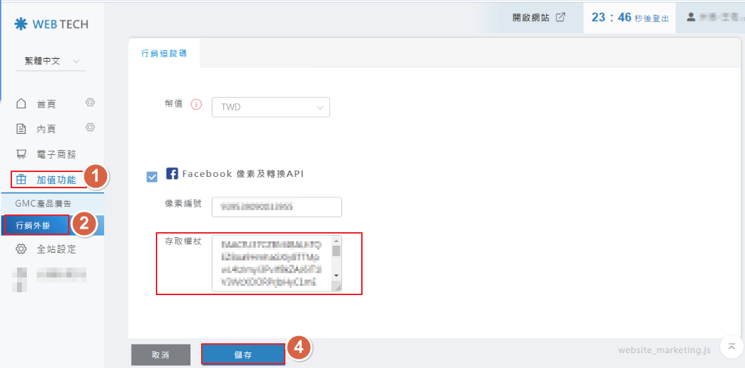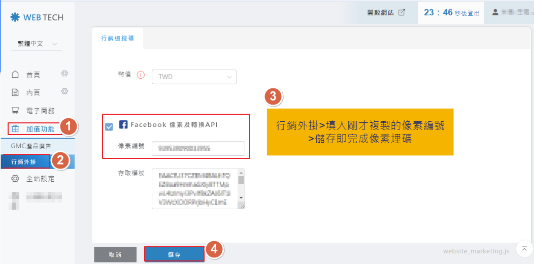 - 方法2.2 登入米洛網站後台→加值功能→行銷外掛→填入剛才複製的像素編號→儲存即完成像素埋碼