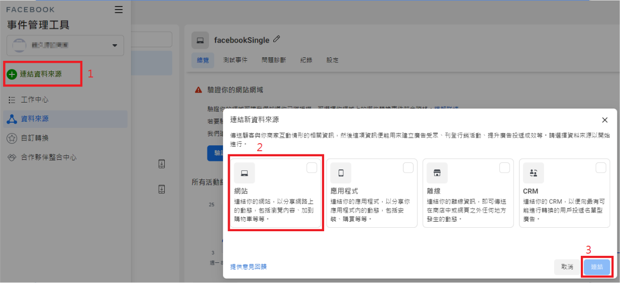 Step 1 開啟事件管理工具 → 連結資料來源 → 網站