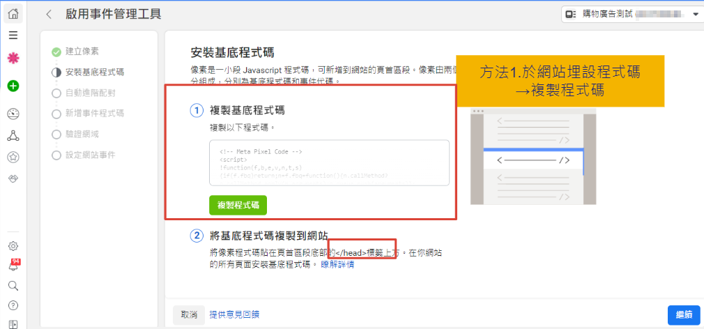 - 方法1 於網站埋設程式碼→複製程式碼→提供給貴公司網站負責之輔導專員,專員協助埋設代碼至網站