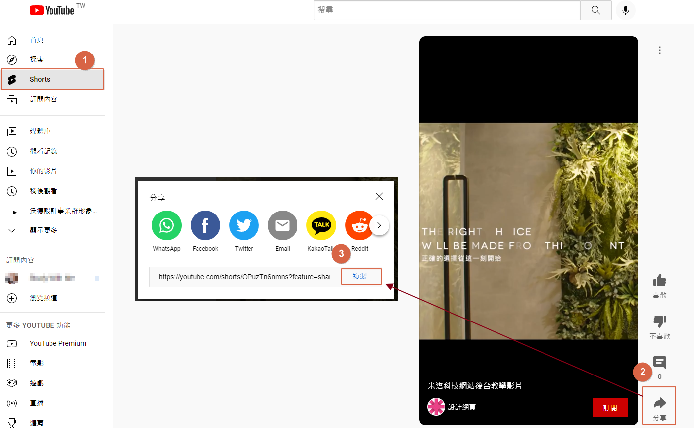Step1.找到您的Shorts影片連結並先進行網址複製(可先存至電腦記事本):