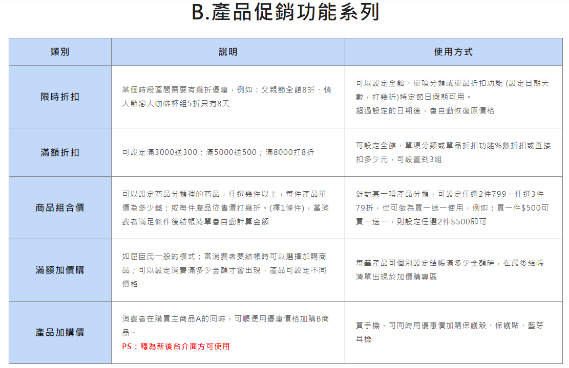 B、產品促銷功能系列: