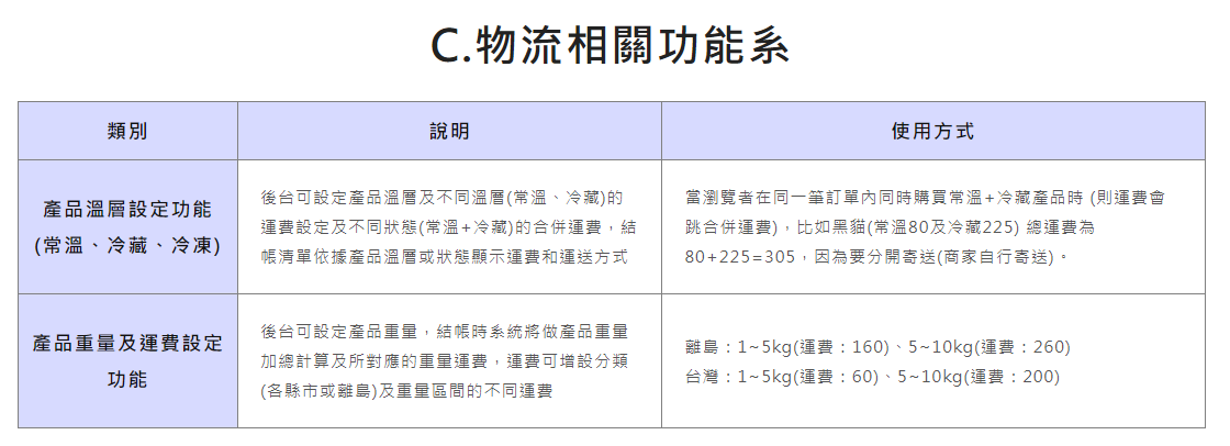 產品溫層設定功能、產品重量及運費設定功能