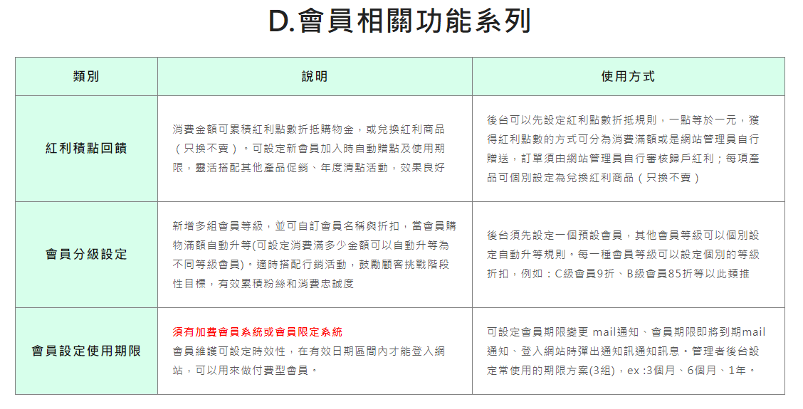 D、會員相關功能系列:紅利積點回饋、會員分級設定、會員設定使用期限
