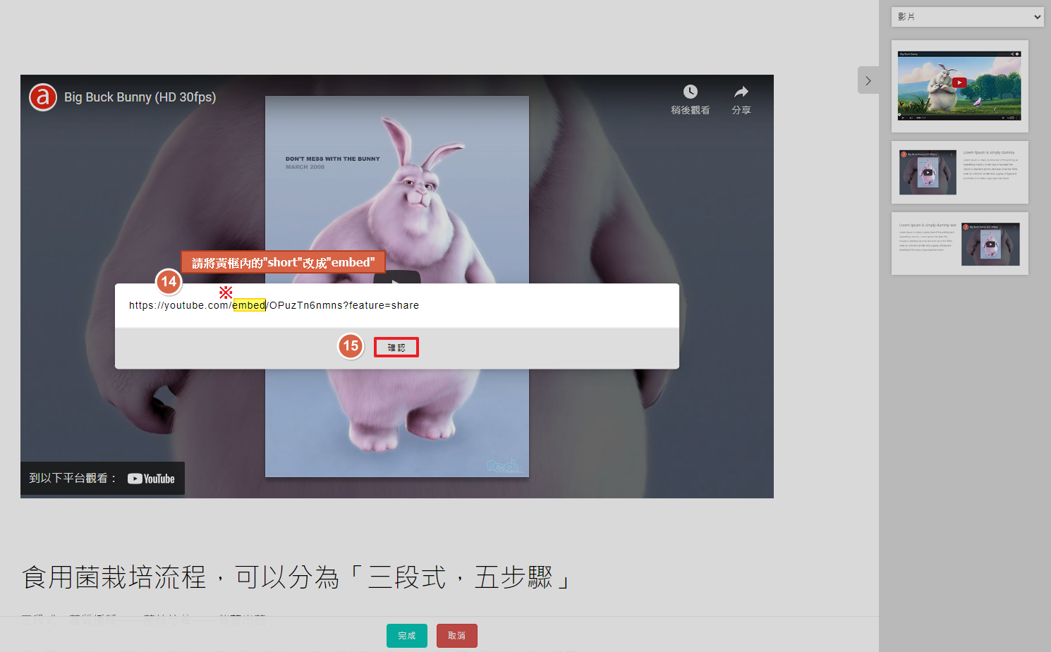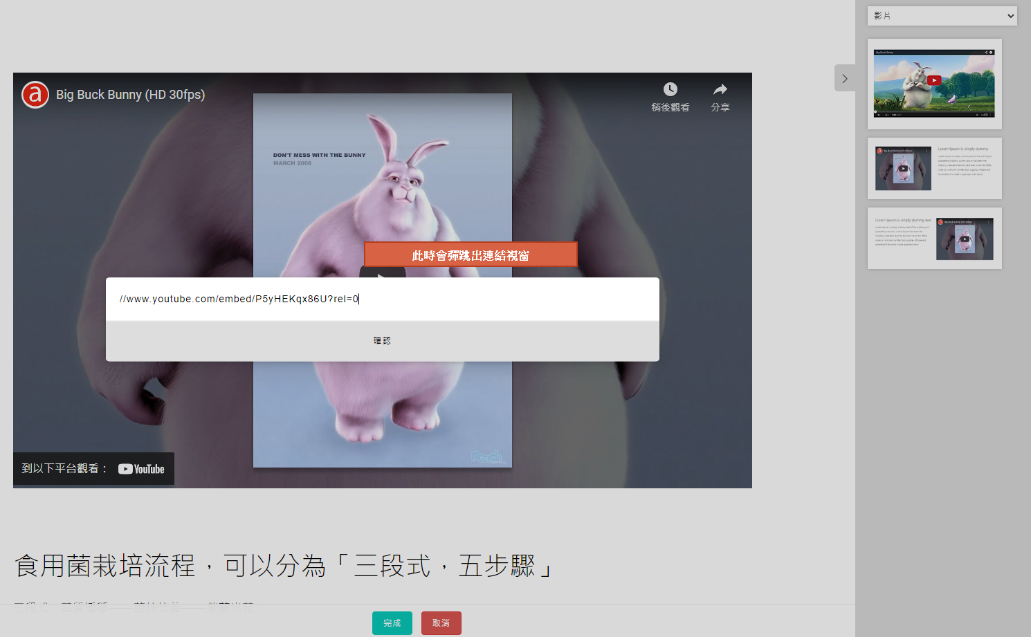 Step5. 檢查連結是否正確,正常顯示會有影片圖像>完成>儲存,即完成短影音嵌入!