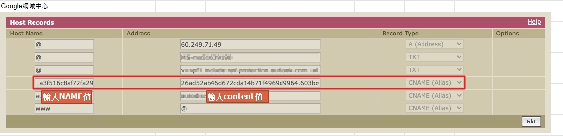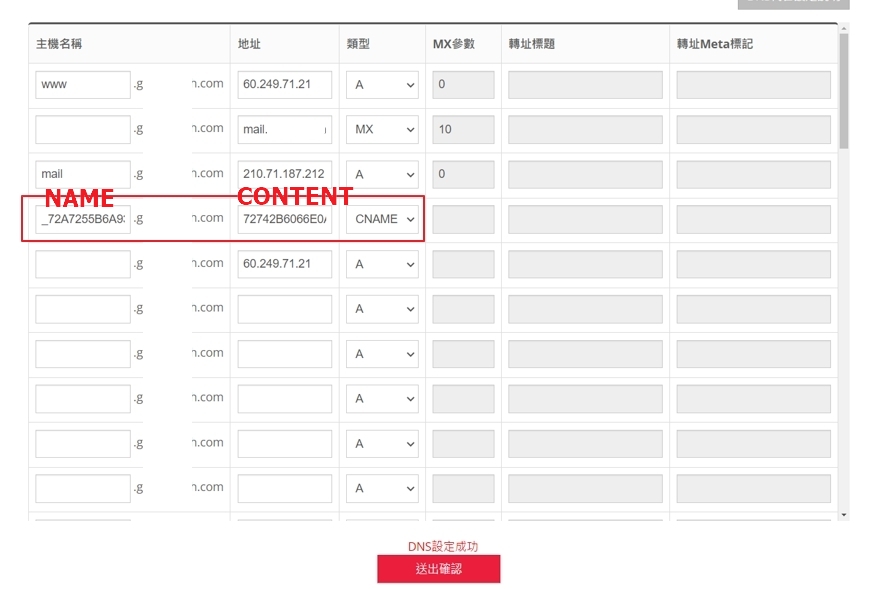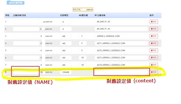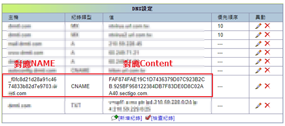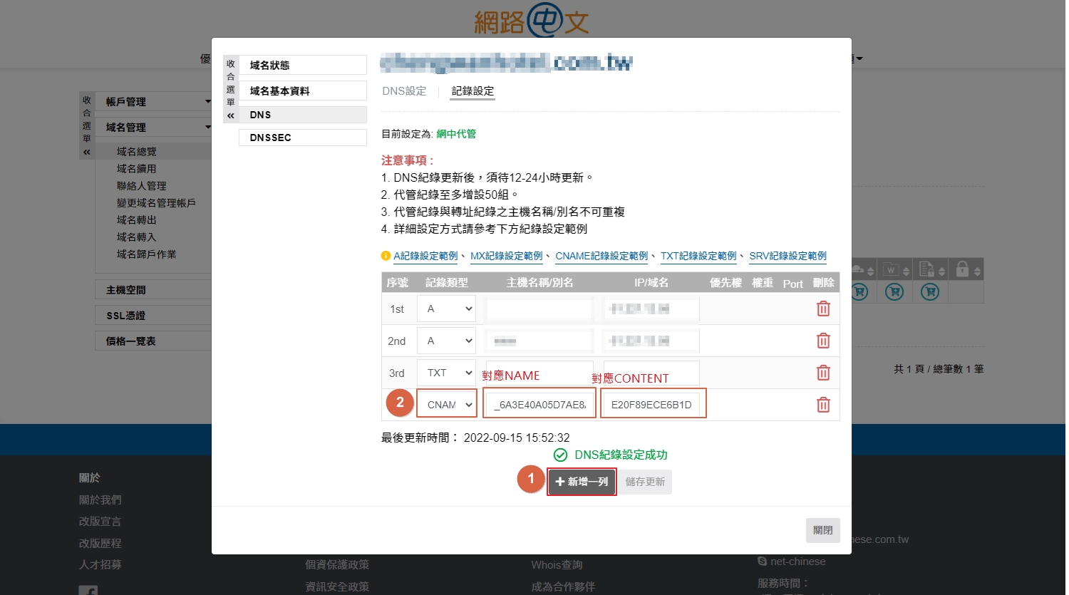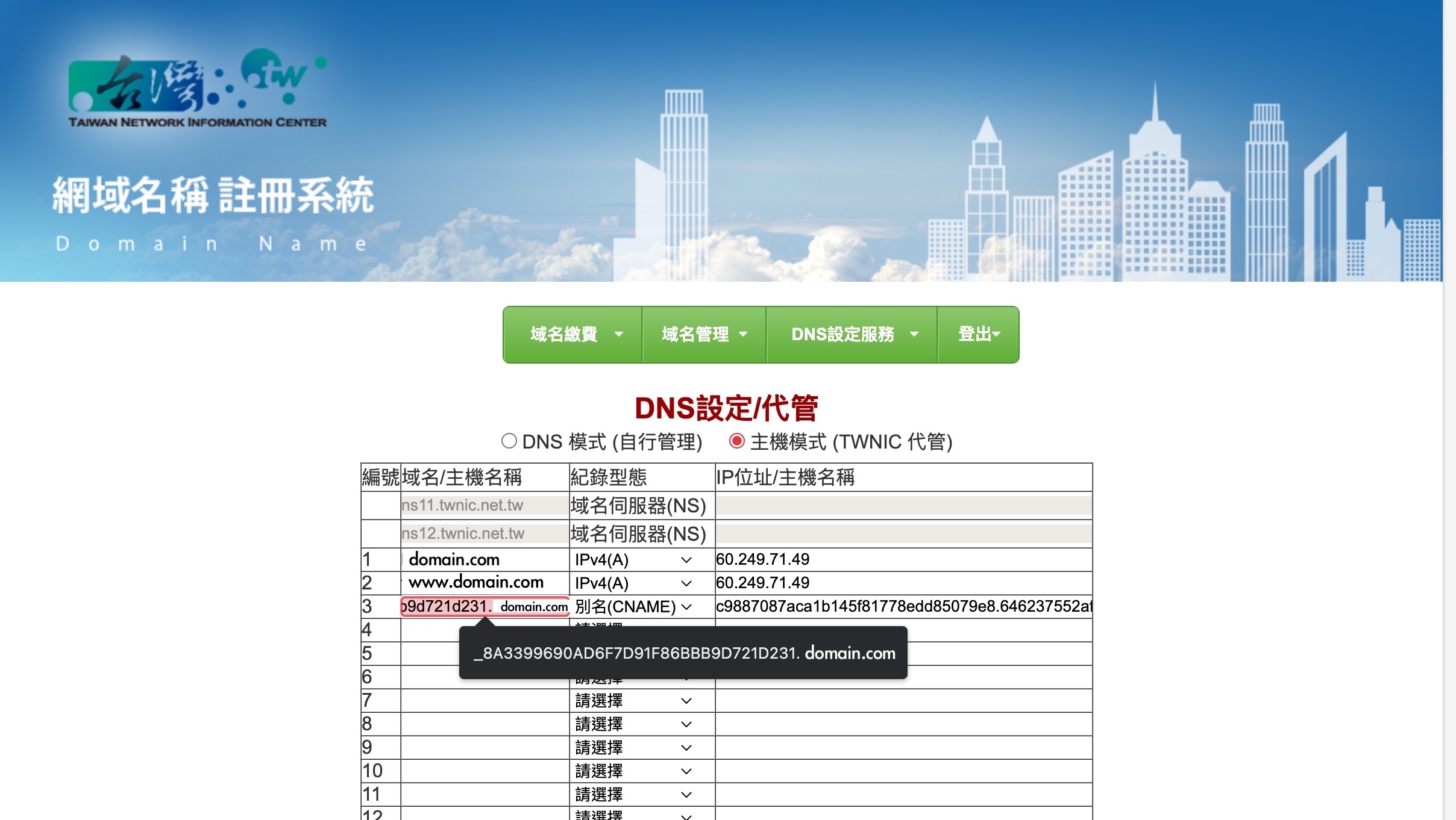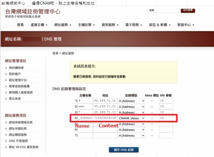 ※若登入HINET無此畫面(或DNS顯示為自管),勿直接切換為DNS代管,請聯絡企業信箱服務商代為修改設定