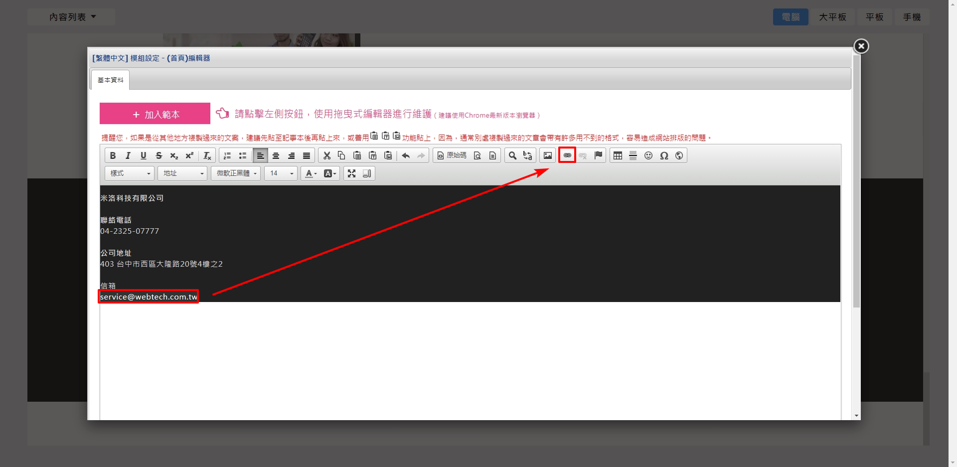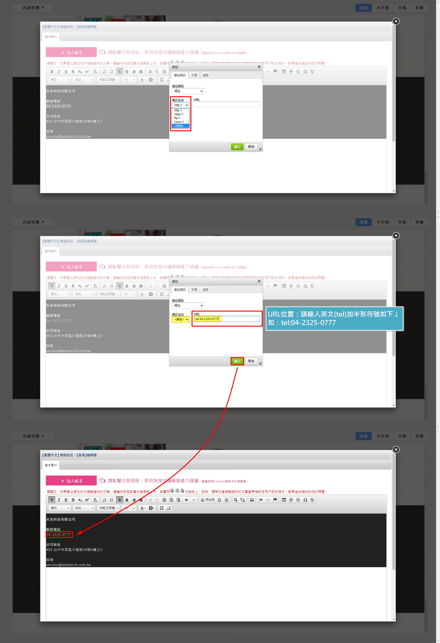 ※ 如果您想在您的網頁中,將電話資訊設置超連結功能,請依照下列步驟操作即可完成唷!
