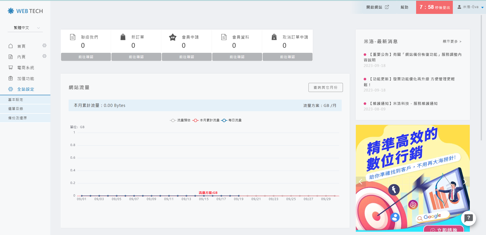 硬碟/資料庫使用量展示:主要能夠讓管理者快速掌握目前主機硬碟與資料庫使用的概況此篇教學主要為初次後台首頁導覽,若您閱讀完此篇後,想更深度了解後台使用的說明,我們另外有製作詳細的影片教學