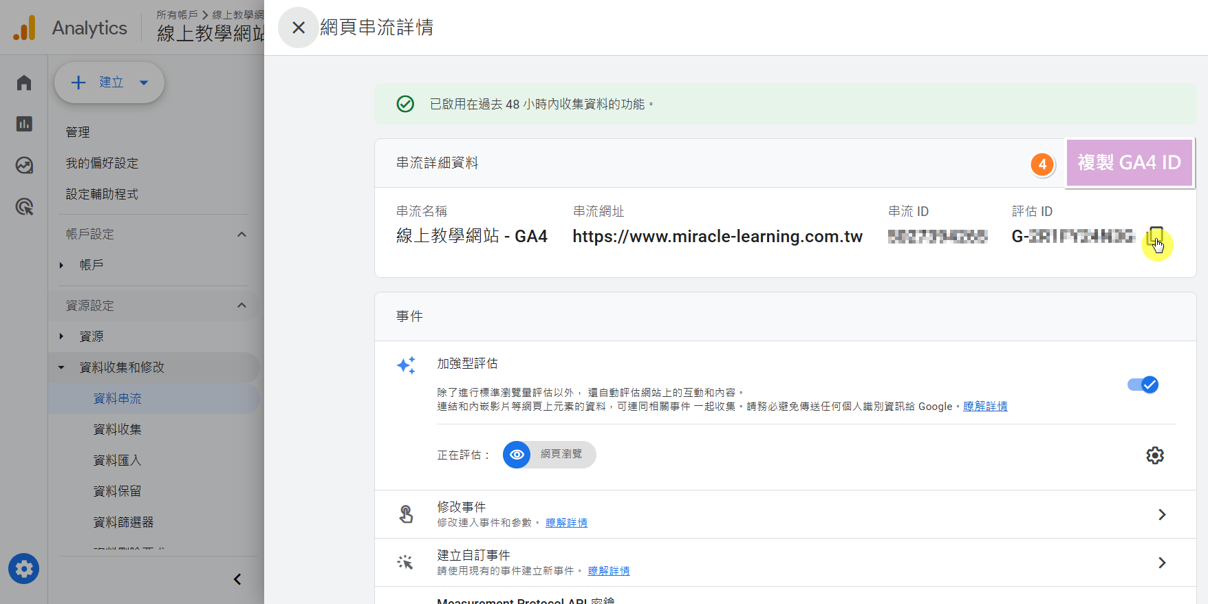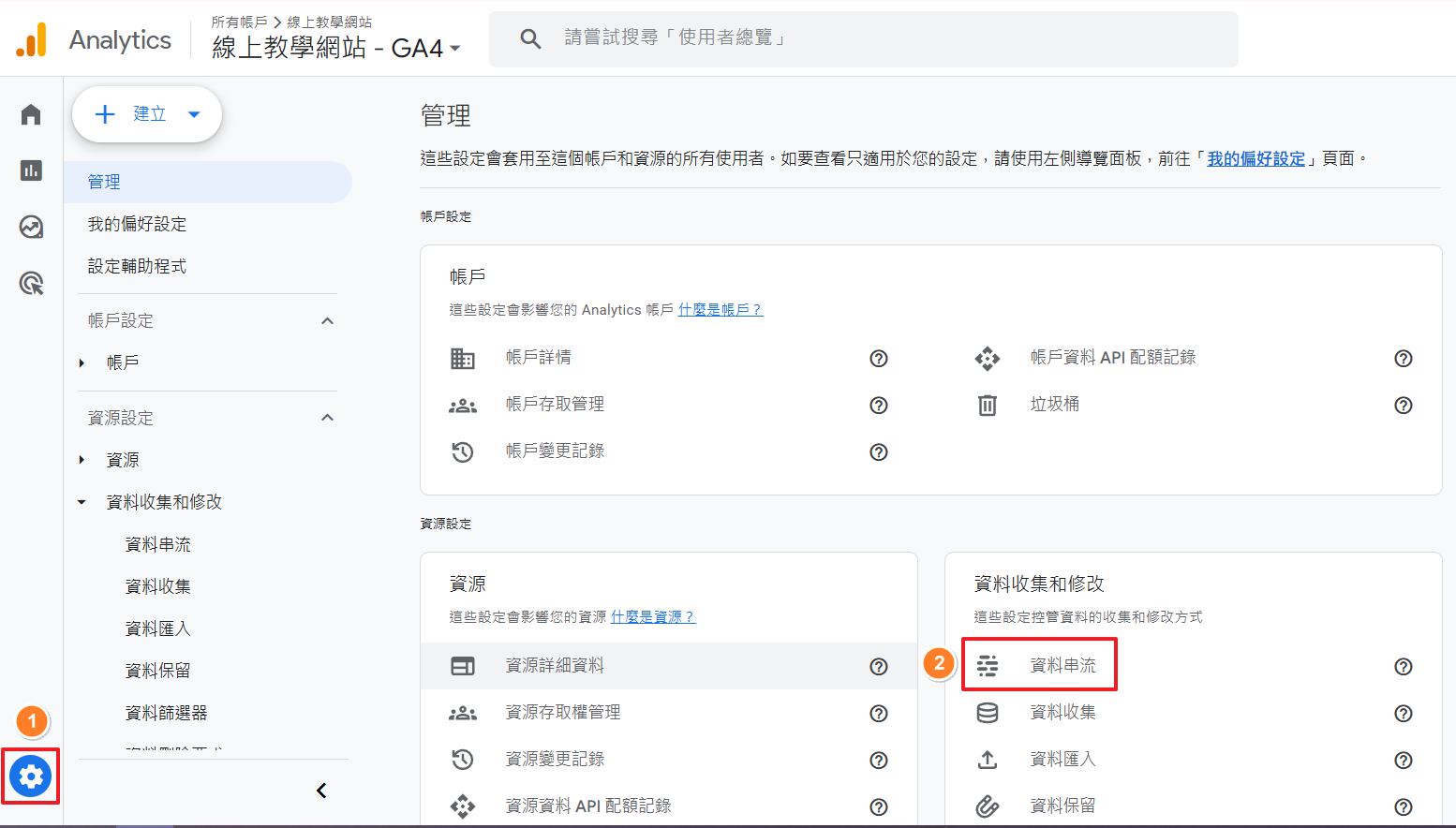 在「資源設定」>「資料收集和修改」>點選「資料串流」。