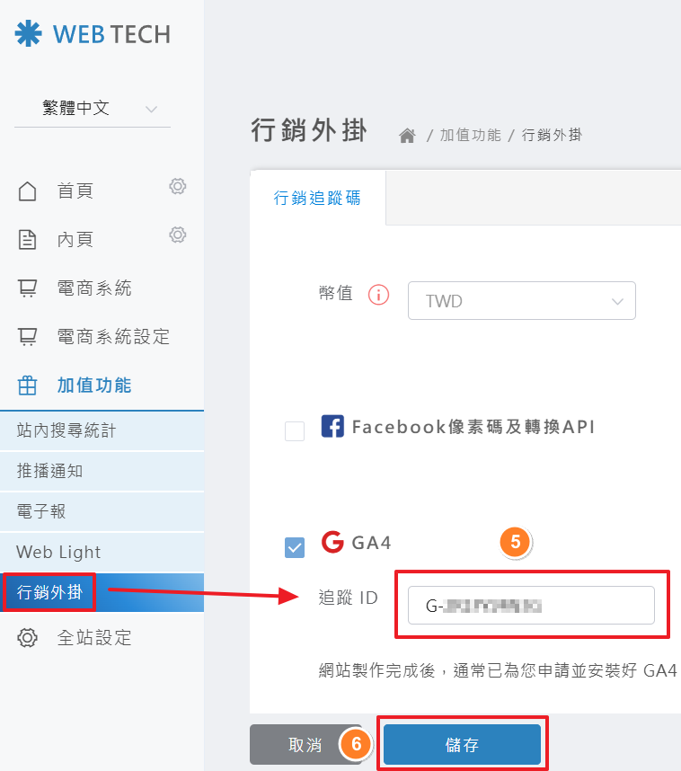 回到後台,點選「加值功能」>「行銷外掛」>勾選GA4,並貼上剛剛複製的評估ID。